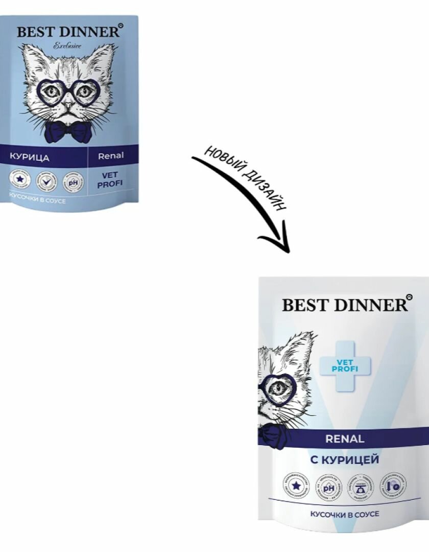Best Dinner Exclusive Vet Profi Renal диетические паучи для взрослых кошек для профилактики заболеваний почек, с курицей, кусочки в соусе - 85 г х 24 шт