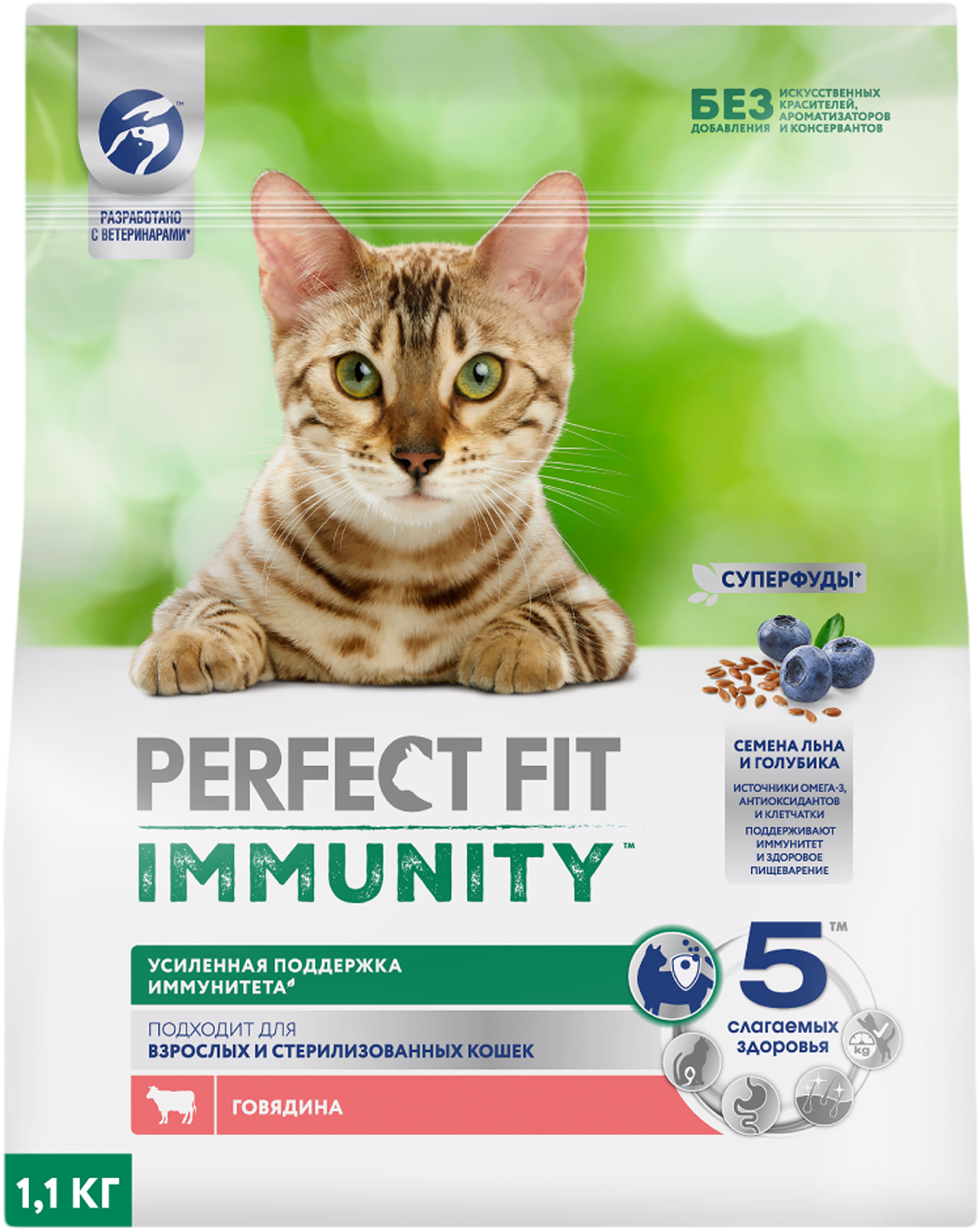 Perfect Fit Immunity корм для иммунитета кошек, говядина, семена льна, голубика, 1,1 кг.