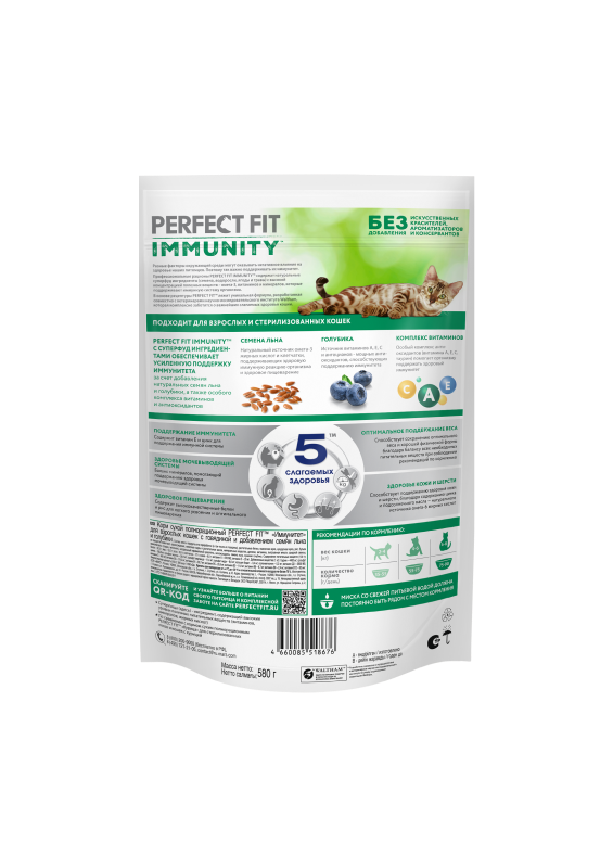2 уп Perfect Fit Immunity Корм сухой для кошек, говядина, семена льна и голубика, 580 гр.