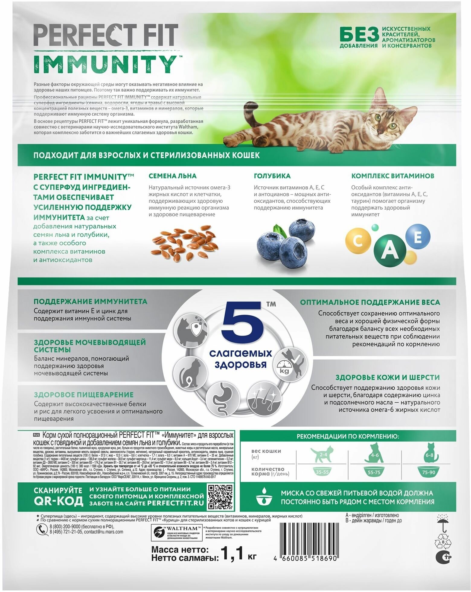 Купить Сухой корм Perfect Fit Immunity для иммунитета кошек говядина, семяна льна, голубика 1.1кг