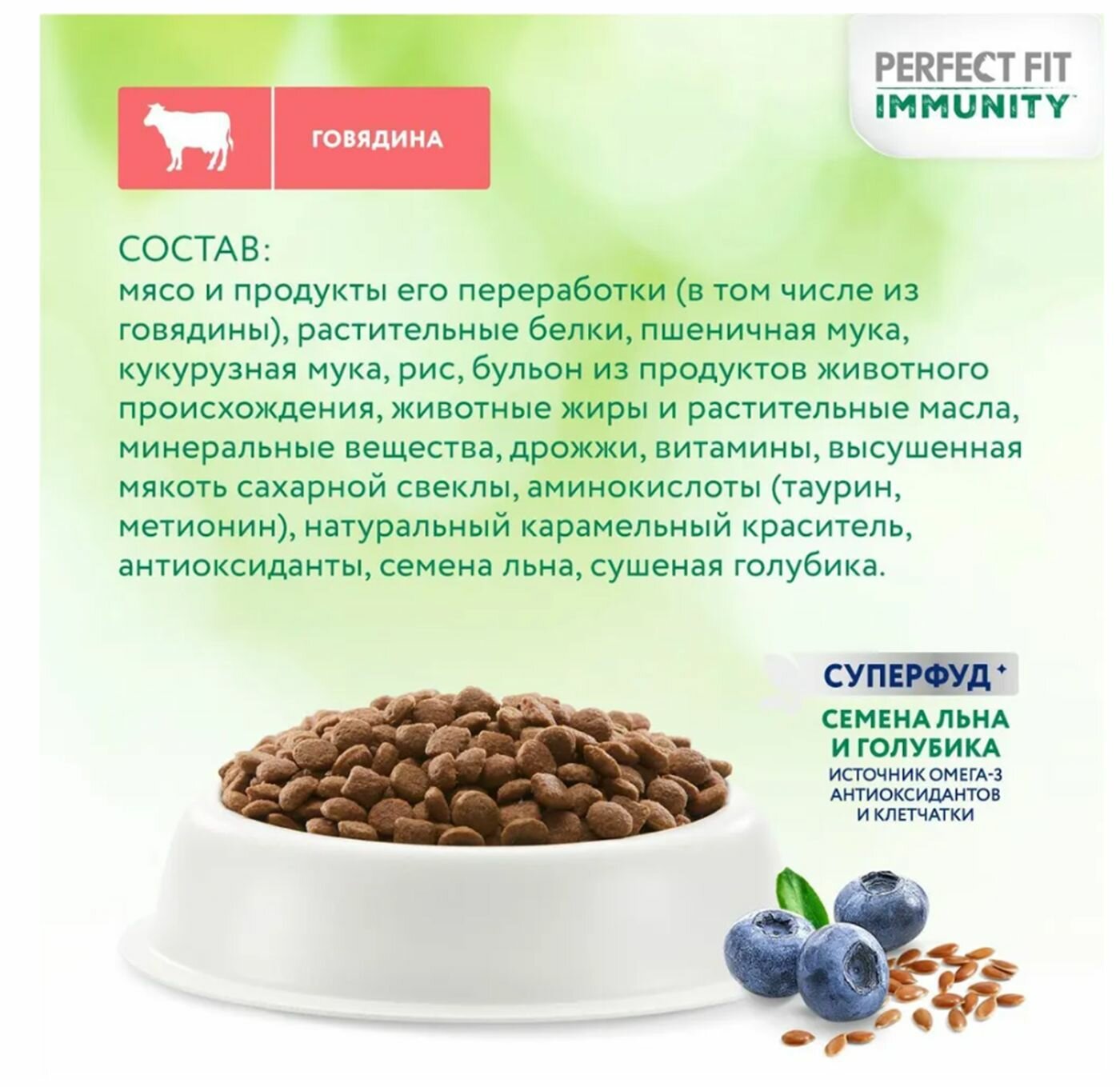 Сухой корм Perfect Fit Immunity для поддержания иммунитета кошек, с говядиной и добавлением семян льна и голубики, 2 шт по 580 г