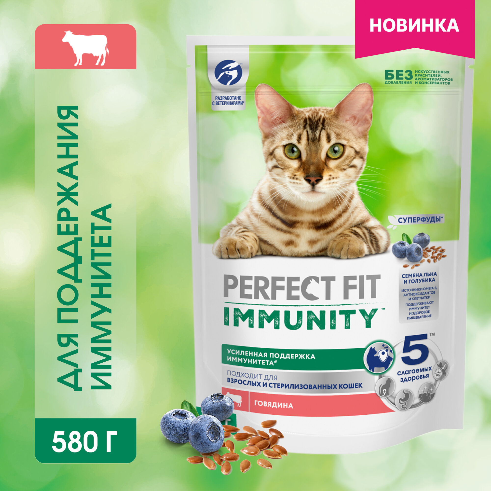 Купить Сухой корм Perfect Fit Immunity для поддержания иммунитета кошек, с говядиной и добавлением семян льна и голубики, 2 шт по 580 г