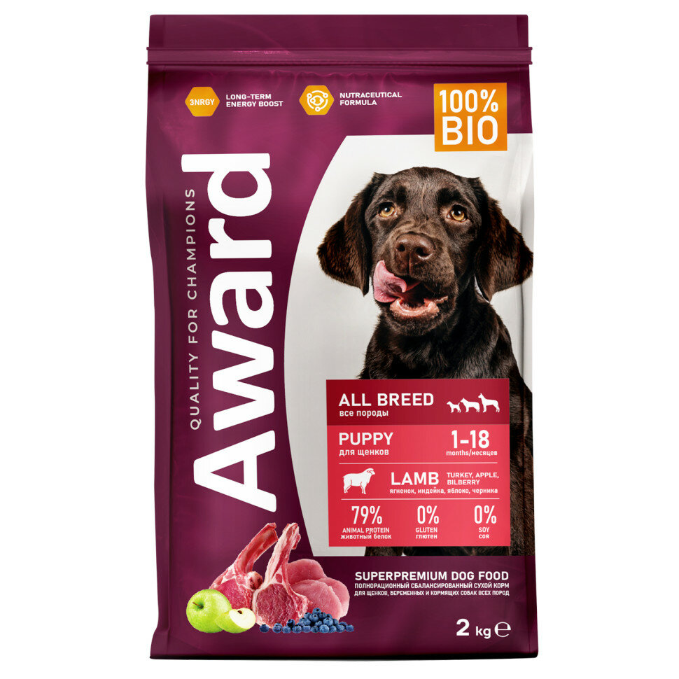Купить AWARD сухой корм для щенков всех пород от 1 месяца, беременных и кормящих сук, с ягненком, индейкой, яблоком и черникой - 2 кг