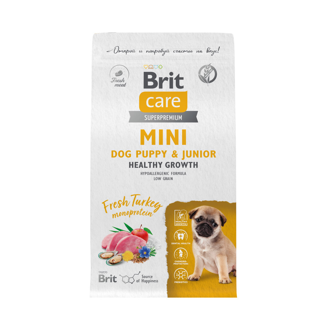 BRIT CARE Mini, Сухой корм с индейкой для щенков и молодых собак мини пород "Puppy&Junior. Healthy Growth",1.5кг