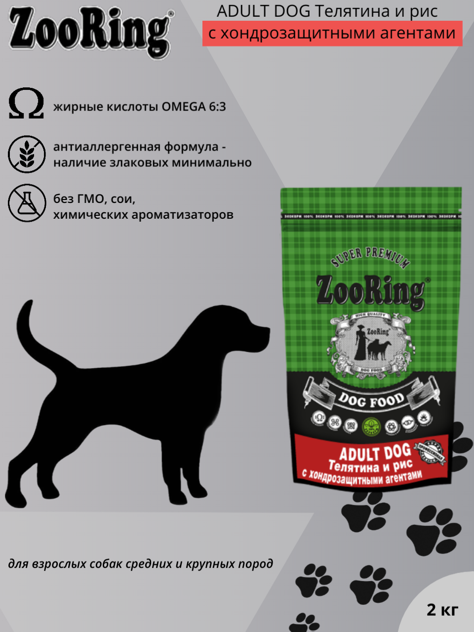 Сухой корм для собак ZooRing Телятина и рис с хондрозащитными агентами, для средних и крупных пород 1уп. х2 кг.
