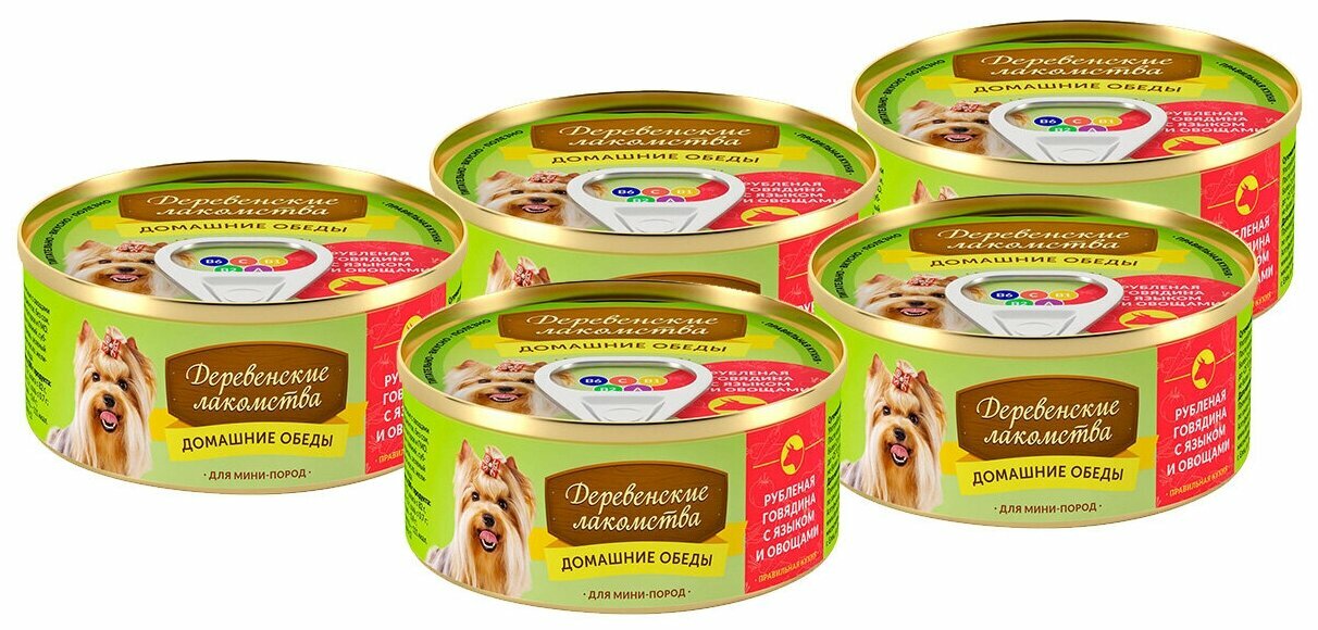 Купить Консервы для собак мини пород Деревенские лакомства Домашние обеды, рубленая говядина с языком и овощами, 100 гр, 5 шт