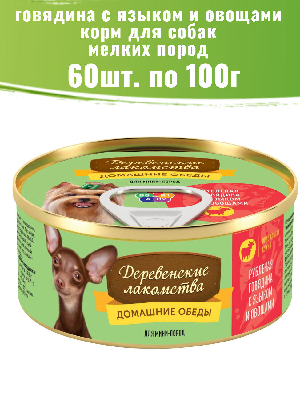 Корм влажный Деревенские лакомства консервы для мини-пород Домашние обеды Рубленая говядина с языком и овощами 100г (10 штук)