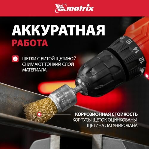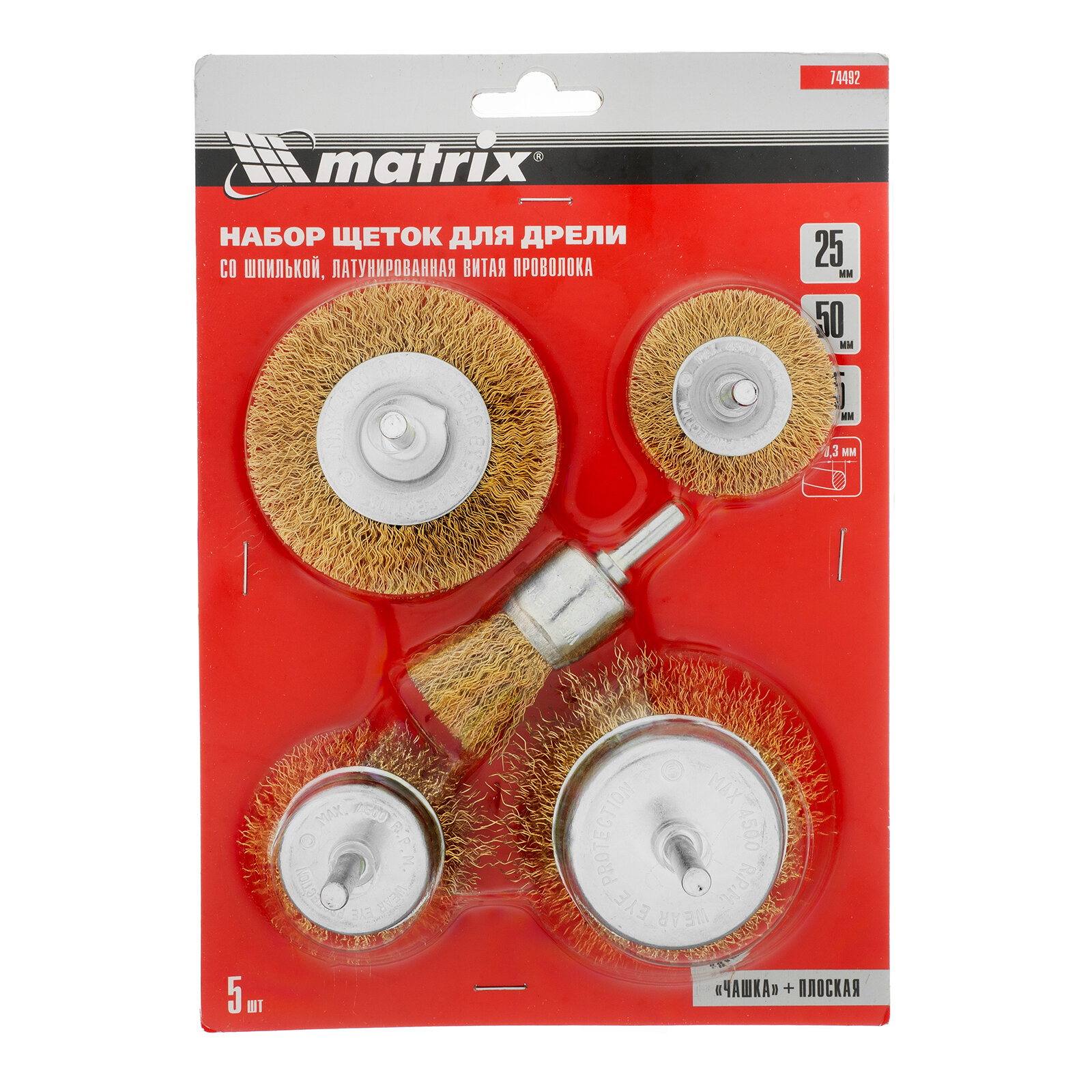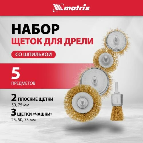 Набор щеток для дрели Matrix 5 шт, 2 Плоские 50-75 мм, 3 Чашки 25-50-75 мм, со шпильками 74492