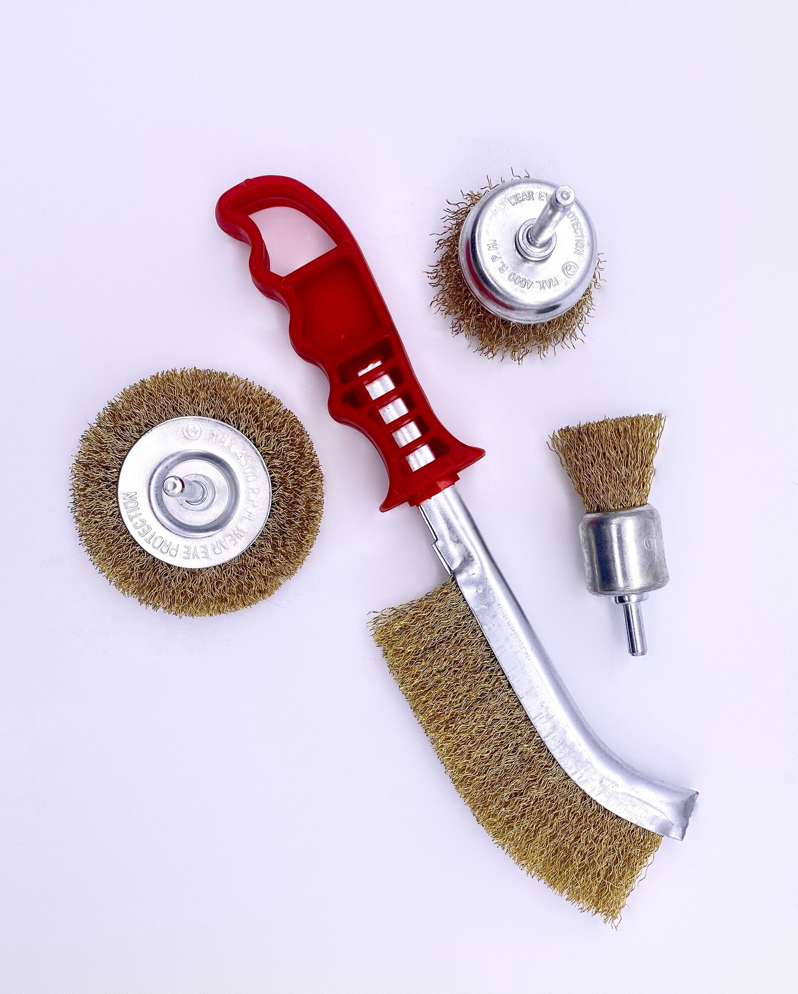 Набор гофрированных щеток, Колир, 4 шт (на дрель: дисковая 75мм, чашеобразная 50мм, торцевая 25мм, щетка ручная с пластиковой ручкой) интересное: