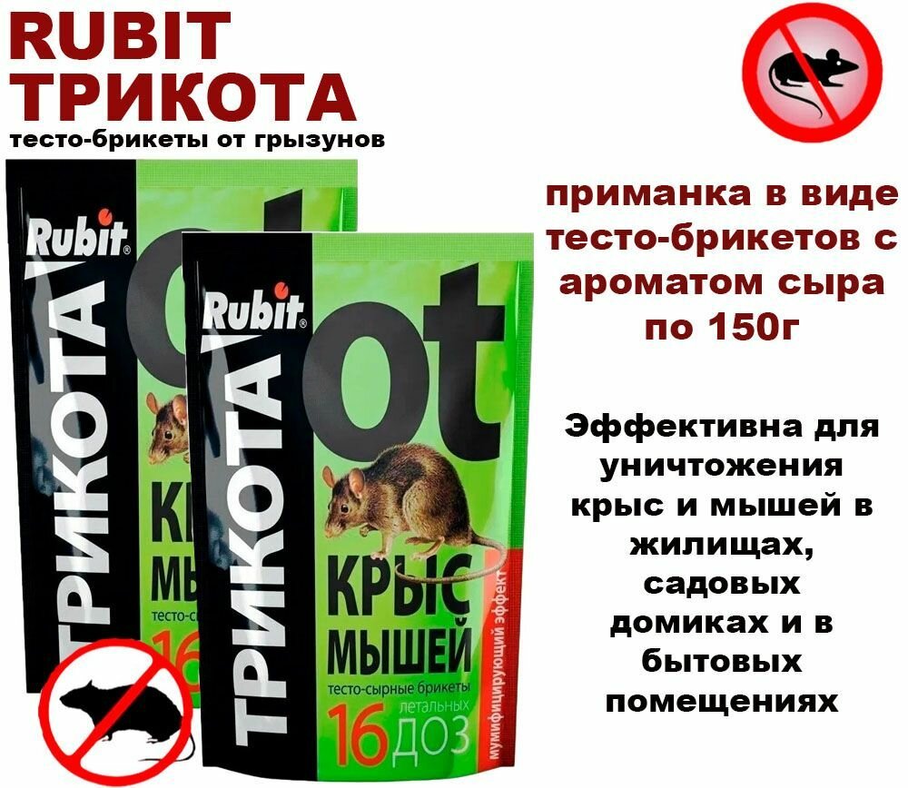 Средство против грызунов крыс и мышей Rubit ТриКота тесто-сырные брикеты мумифицирующий эффект 32 дозы 2X150г