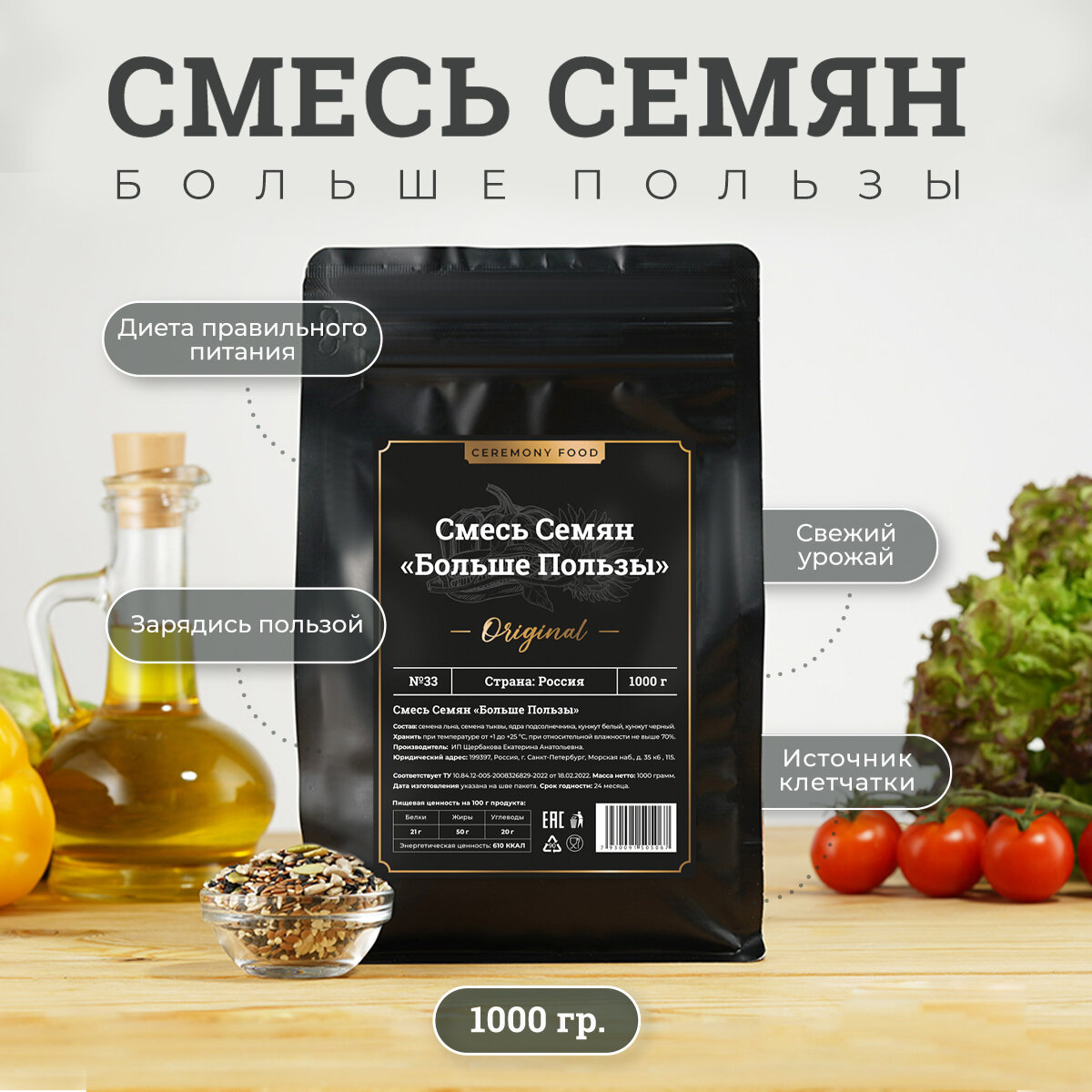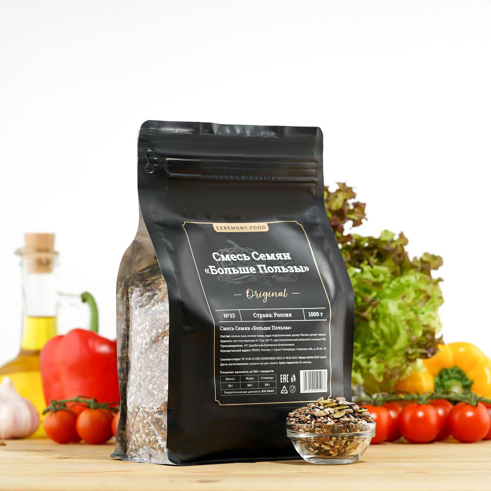 Натуральная Смесь Семян для Салата и Выпечки 1000 гр. CEREMONY FOOD Тыквенные Семечки Очищенные, Семена Льна, Подсолнечника, Кунжут Черный и Белый интересное: