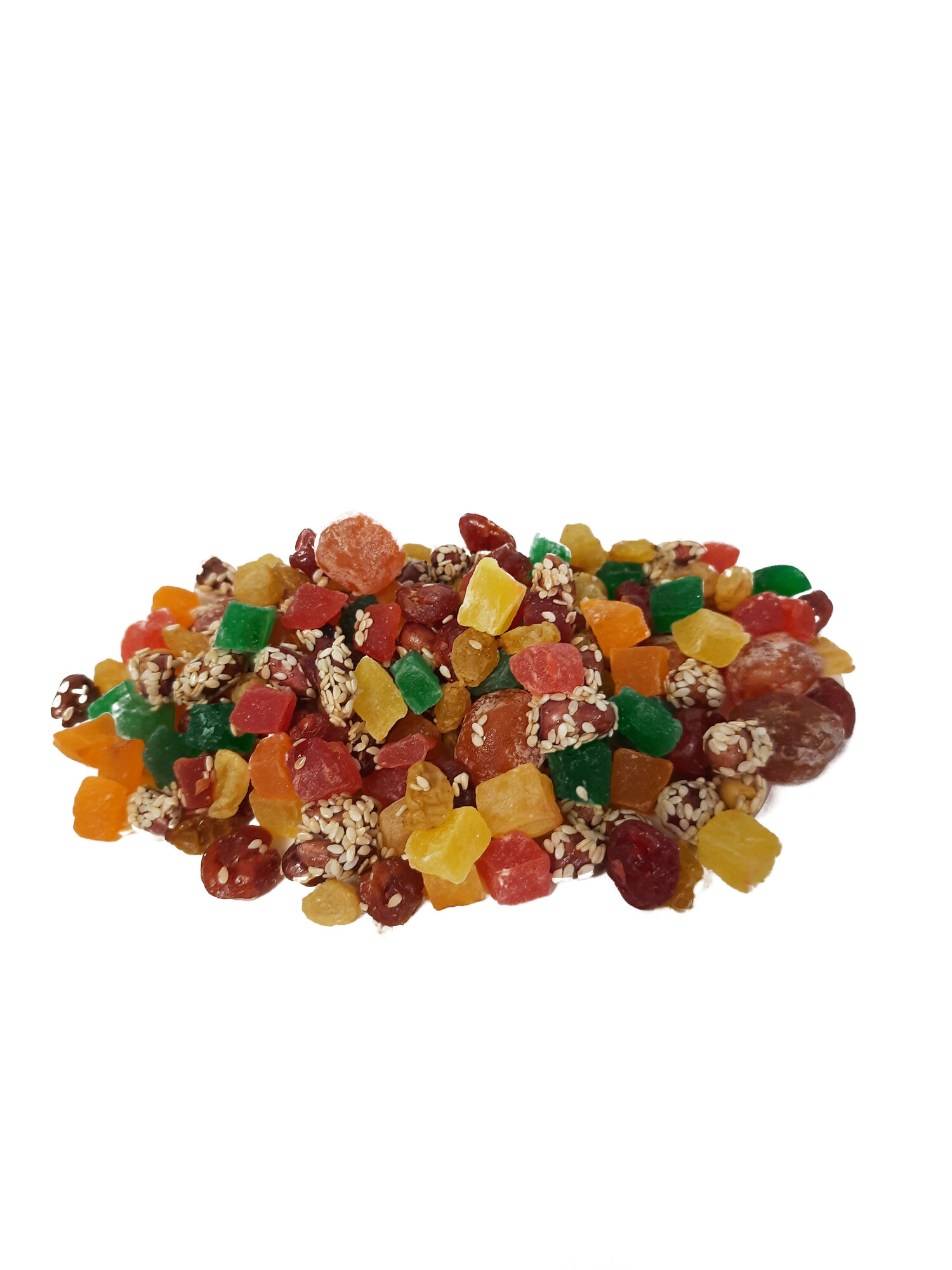 | Состав | Арахис в кунжуте с мёдом, мандарин в сахаре, цукаты из ананаса кубики, вишня вяленая, изюм джамбо Чили |