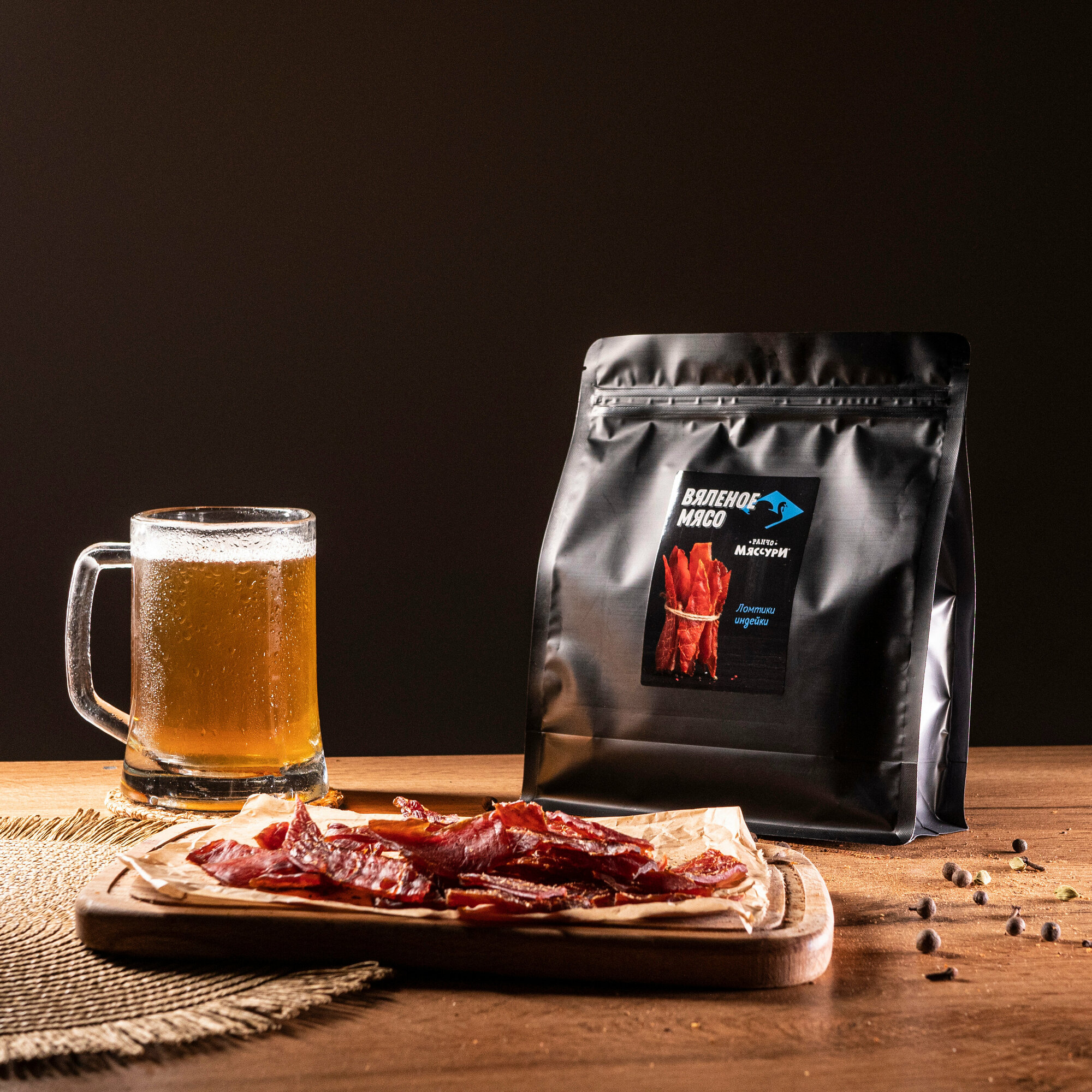 | Комплектация | семь порций сушеного мяса в вакуумных упакрвках, общий крафт пакет с многоразовой затежкой |