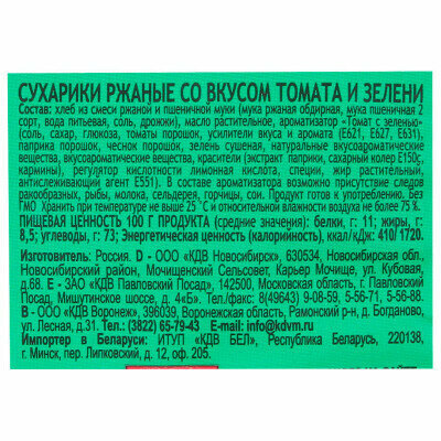 | Состав | мука ржаная, мука пшеничная, вода питьевая, масло растительное, ароматизатор (соль, сахар, глюкоза, порошок томатов, усилители вкуса и аромата (Е621, Е627, Е631), порошок паприки, чеснок-порошок, зелень сушеная, натуральные вкусоароматические вещества, вкусоароматические вещества, красители (экстракт паприки, Е150с, кармины), регулятор кислотности Е330, специи), соль, дрожжи хлебопекарные. Может содержать следы ракообразных, рыбы, молока, сельдерея, горчицы, сои. |