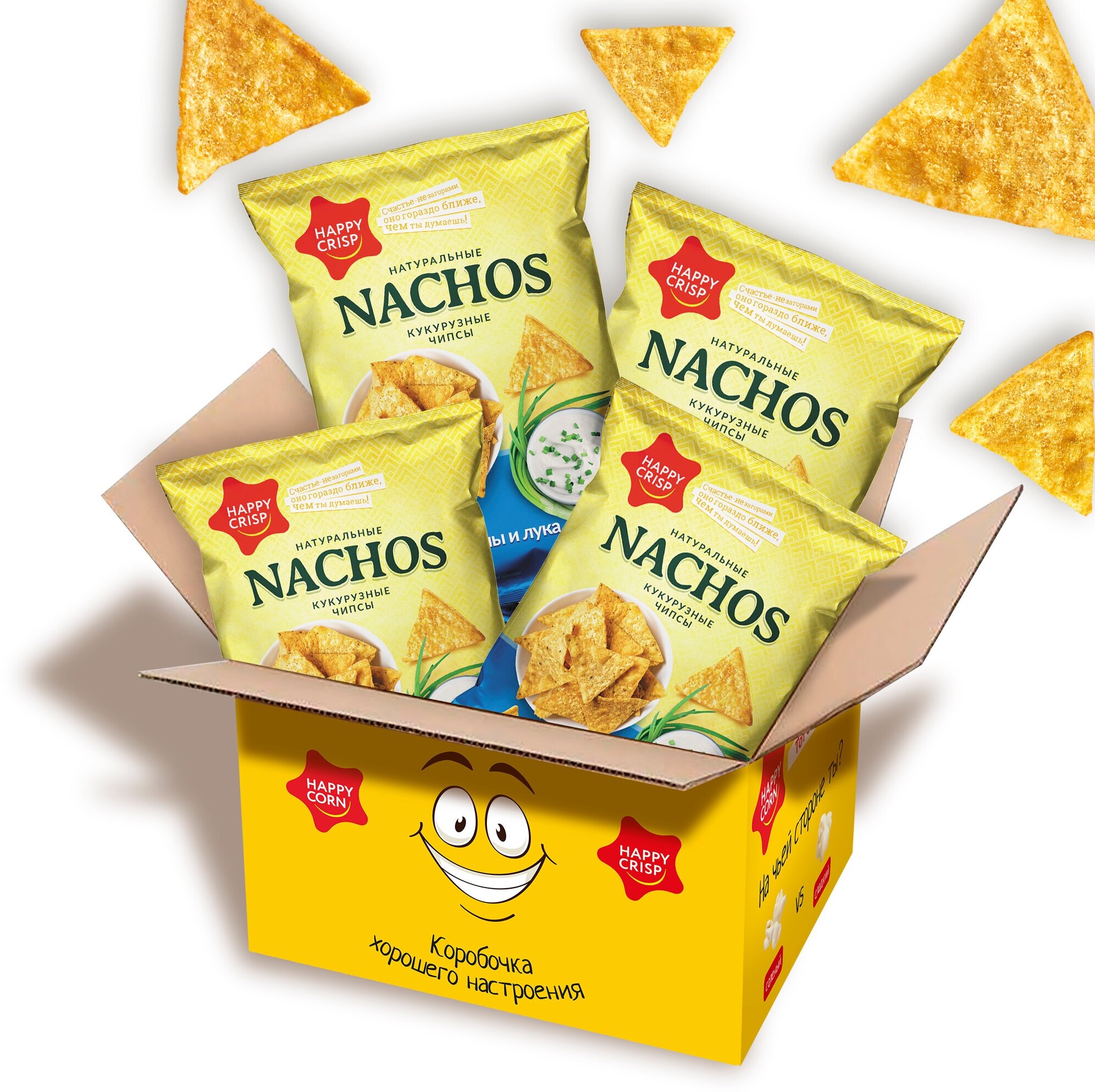 Купить Чипсы кукурузные (начос) HAPPY CRISP со вкусом сметаны и лука 4 шт по 150 г