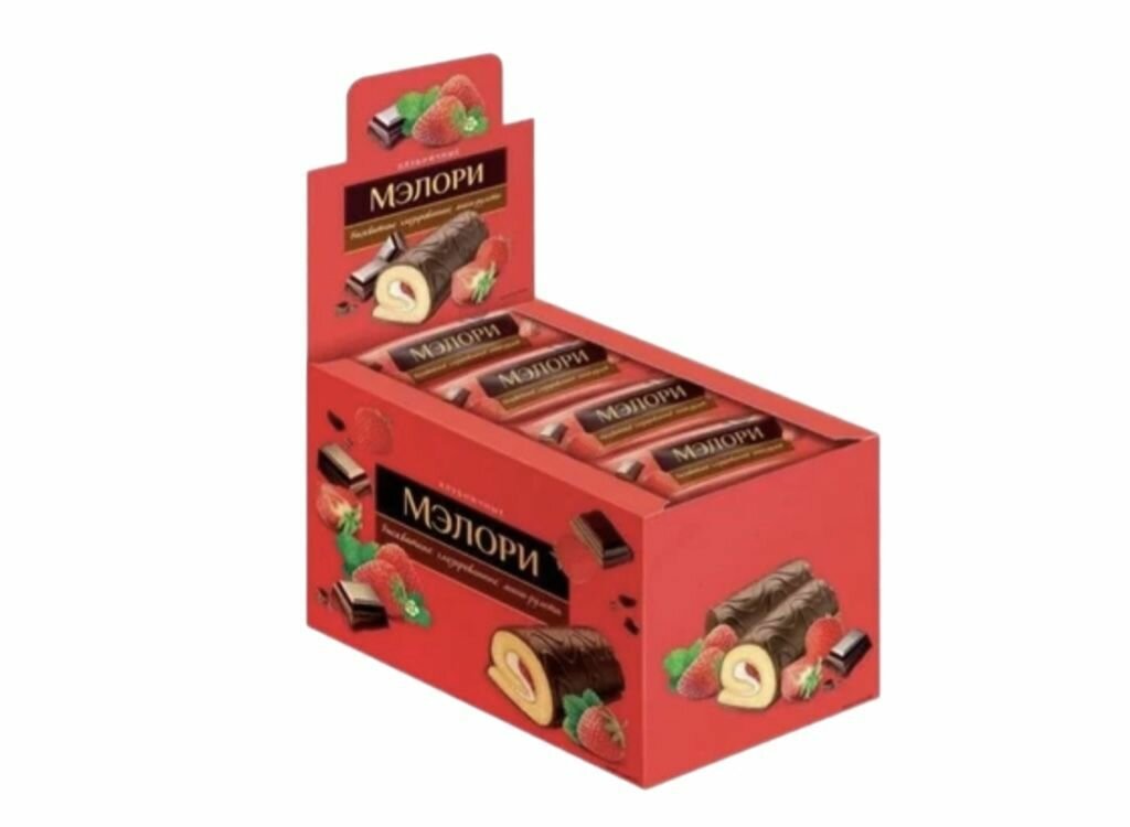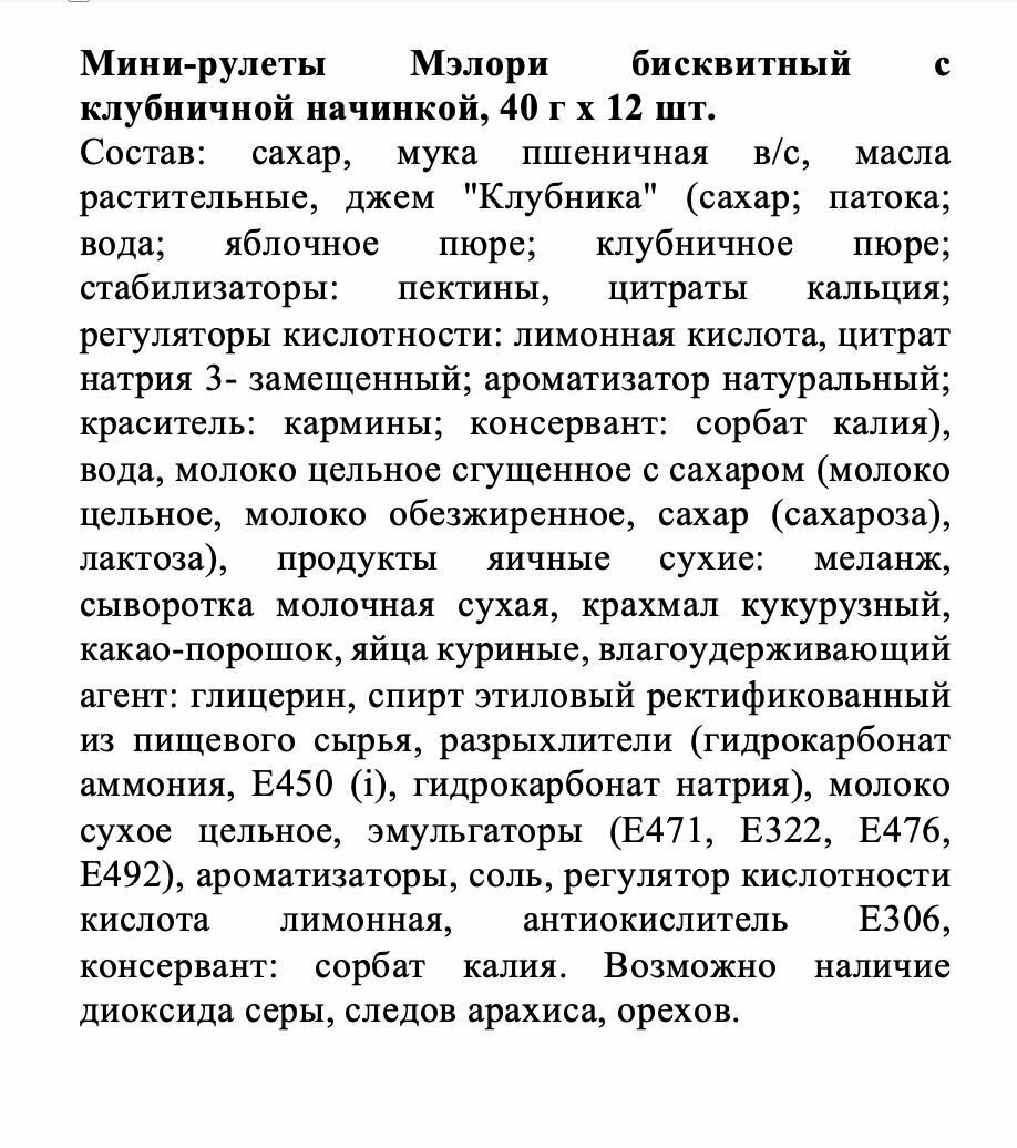 | Состав | Мини-рулеты Мэлори бисквитный с клубничной начинкой, 40 г х 12 шт. Состав: сахар, мука пшеничная в/с, масла растительные, джем "Клубника" (сахар |