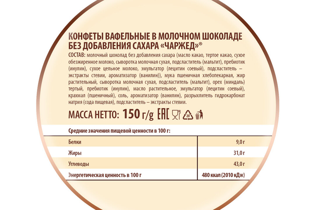 Конфеты вафельные "Чаржед" в молочном шоколаде без добавления сахара, 150г. интересное: