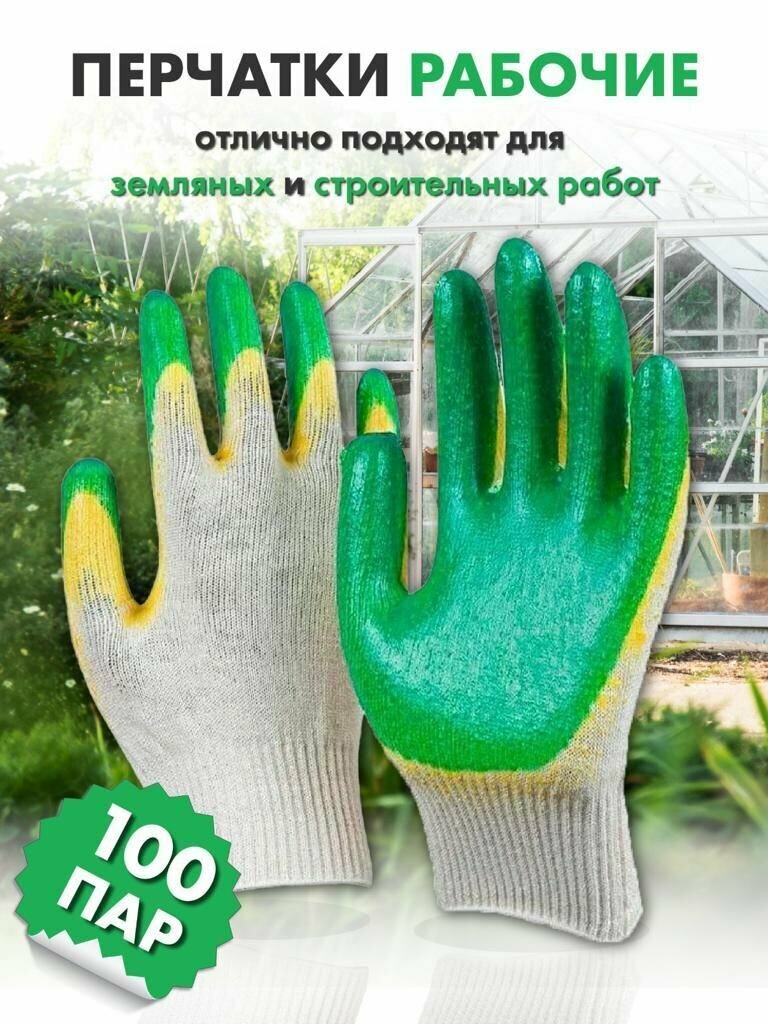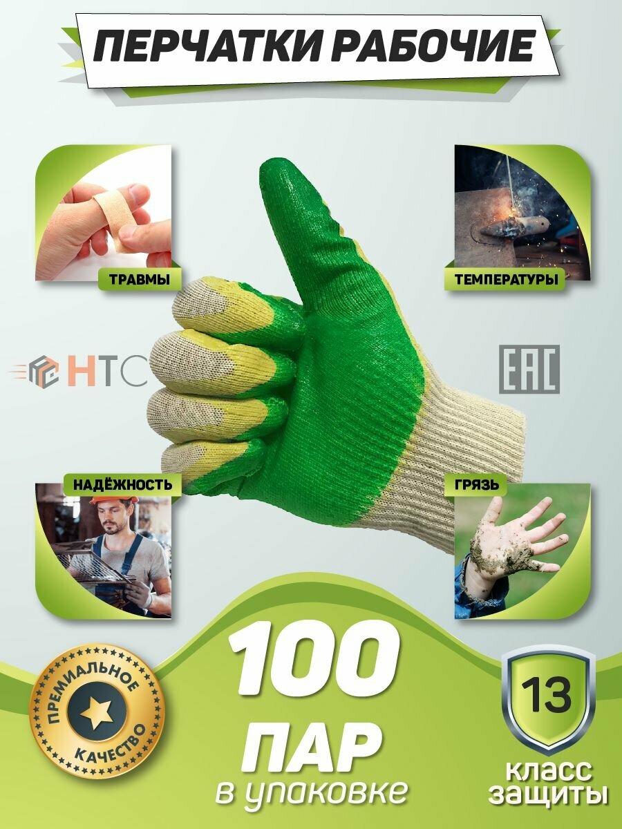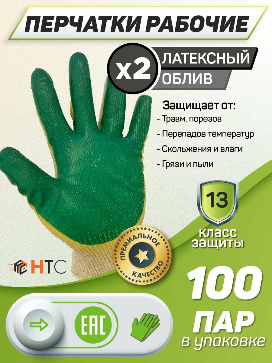 Перчатки рабочие хб 13 класс с двойным латексным покрытием, 100 пар/упак