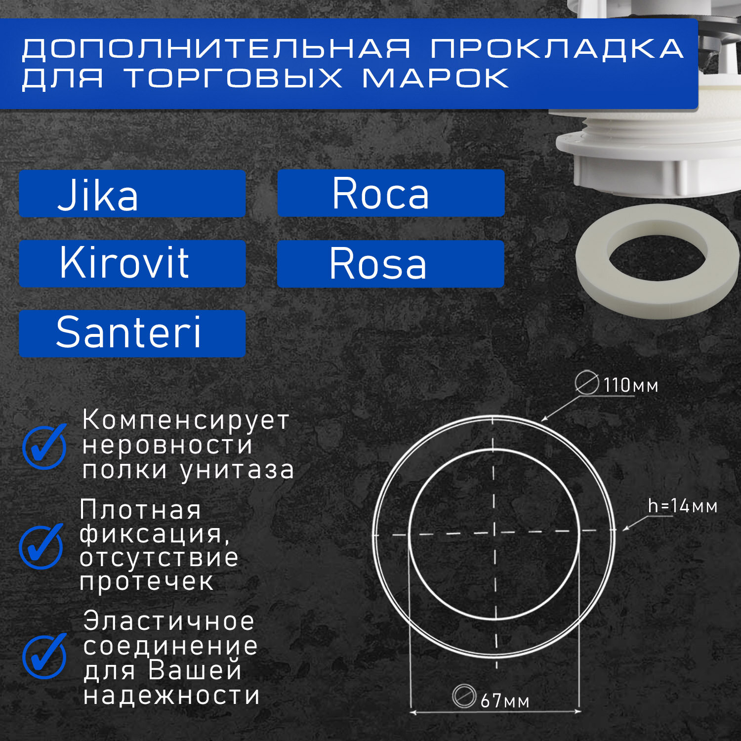 | Дополнительная информация | Совместимость: Оскольская керамика, Лобненский Стройфарфор, Rosa, Jika, Kirovit, Santeri, Roca. А также для всех моделей зарубежных брендов с круглой прокладкой между бачком и унитазом. |