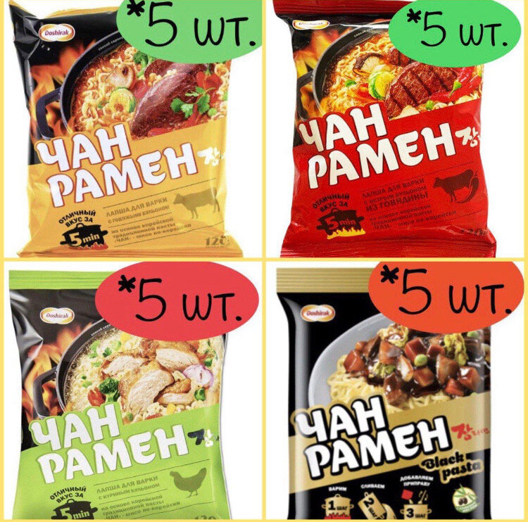 Лапша быстрого приготовления Doshirak Чан рамен со вкусами: Курицы 5 шт, Традиционный 5 шт, Острая говядина 5 шт. и Блек Паста 5 шт. интересное: