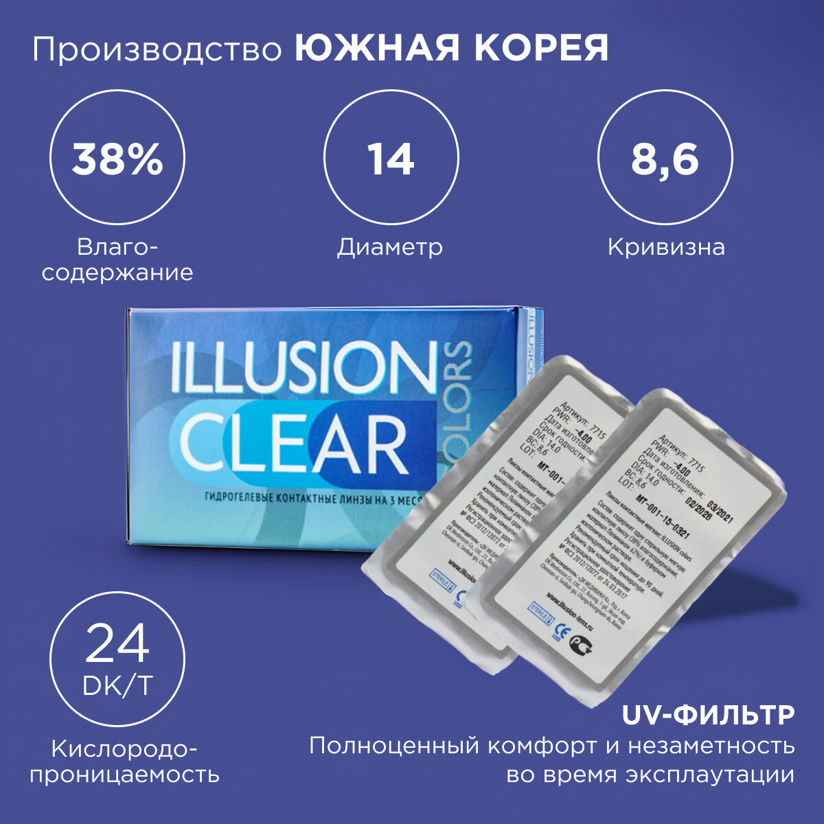Купить Контактные линзы ILLUSION colors CLEAR -7,5 D R8.6 2шт.