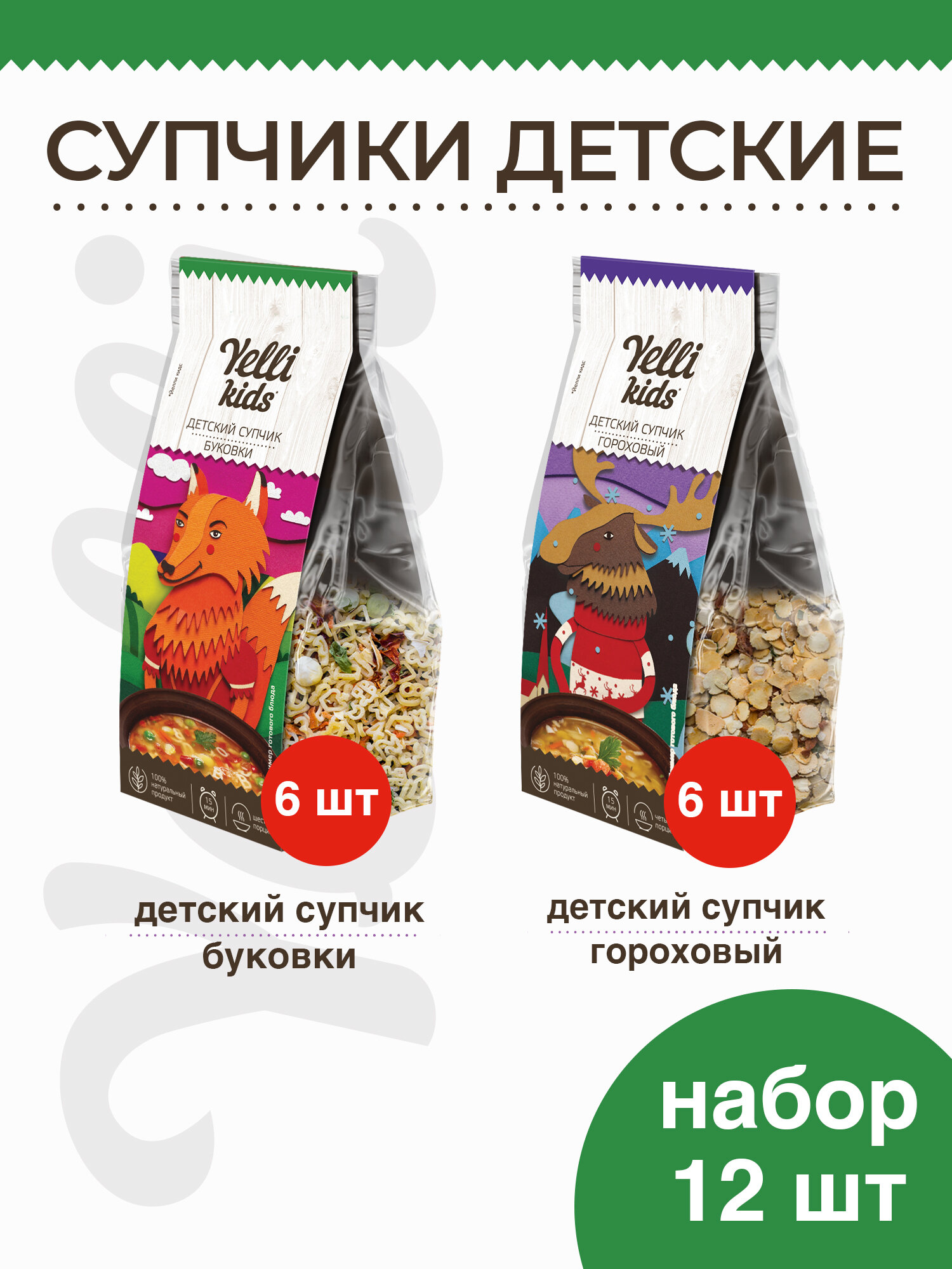 Детские супы Yelli kids 12 шт. (Супчик Буковки 6*80г, Супчик Гороховый 6*100г) интересное: