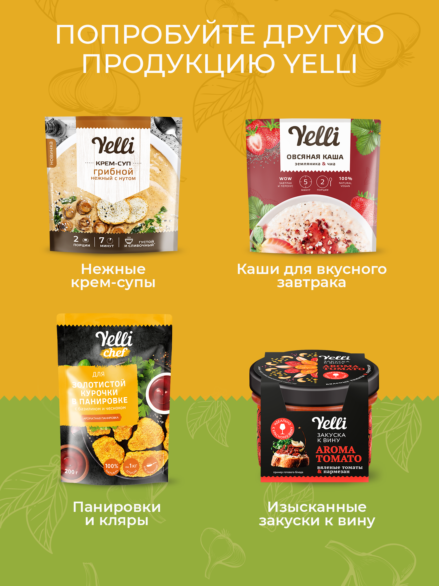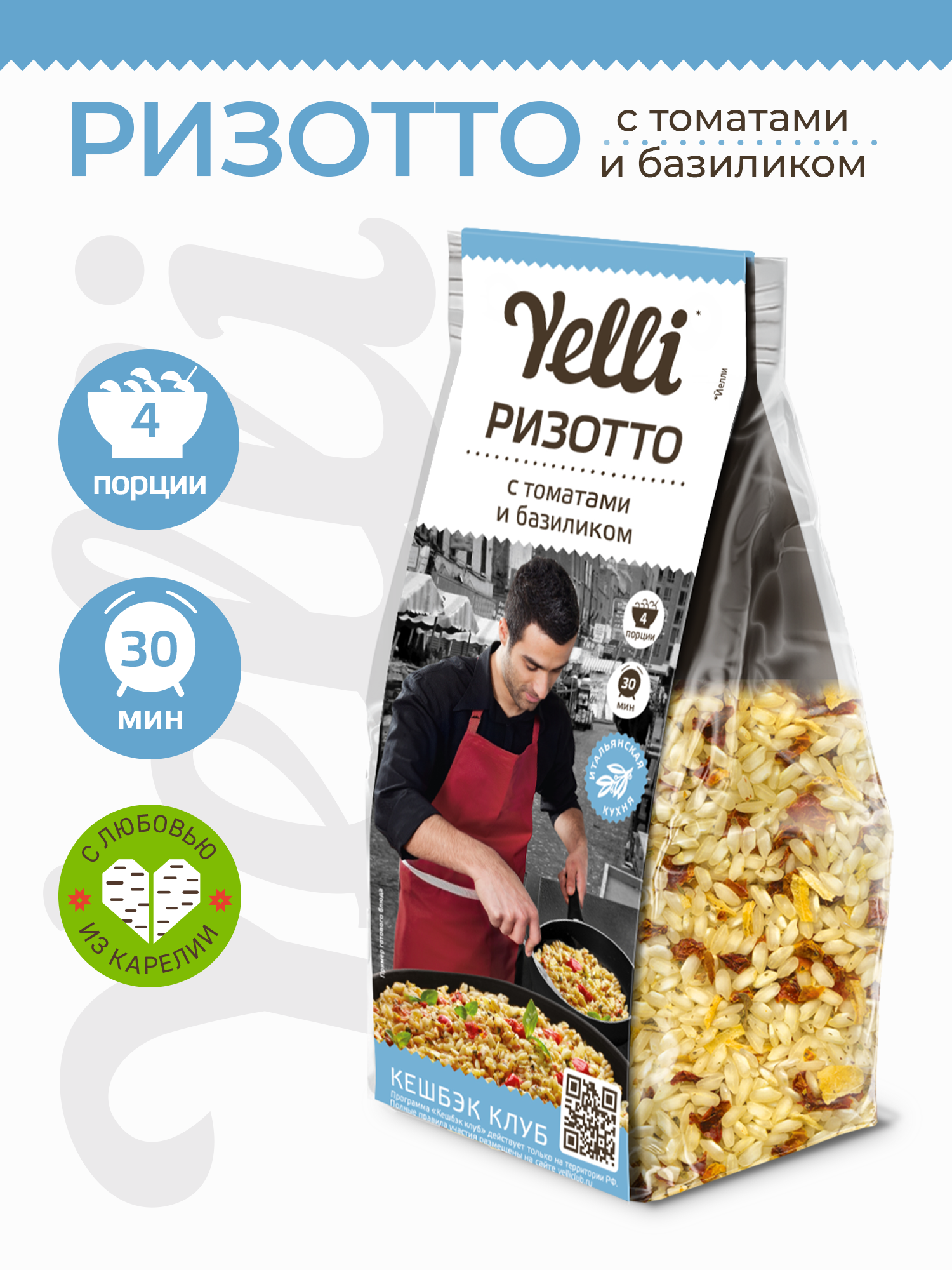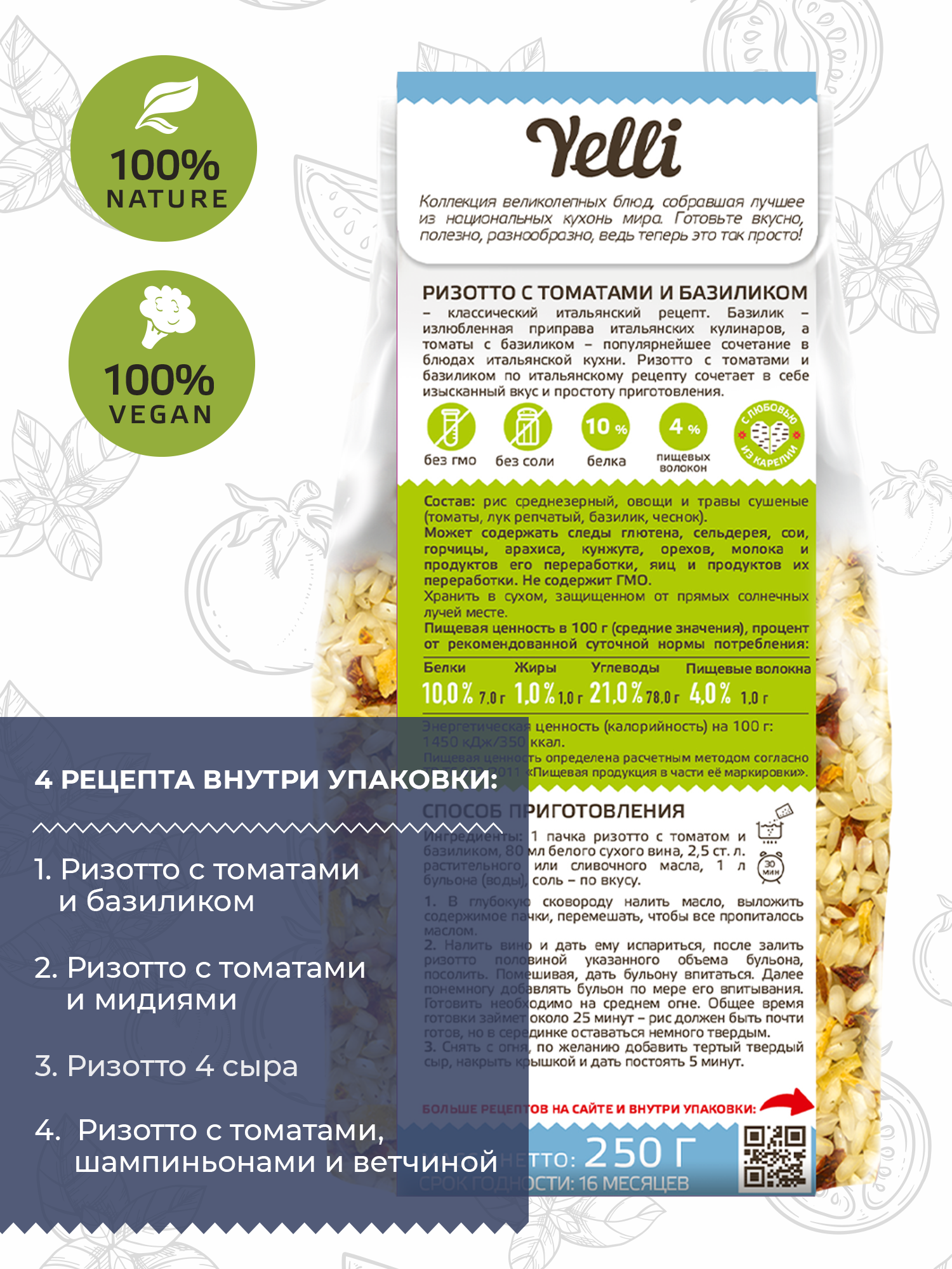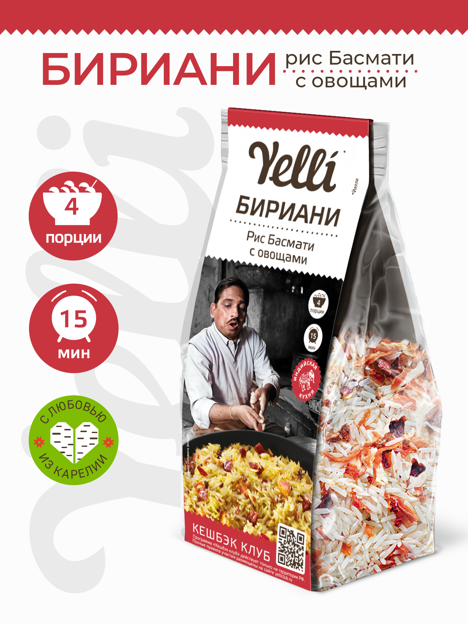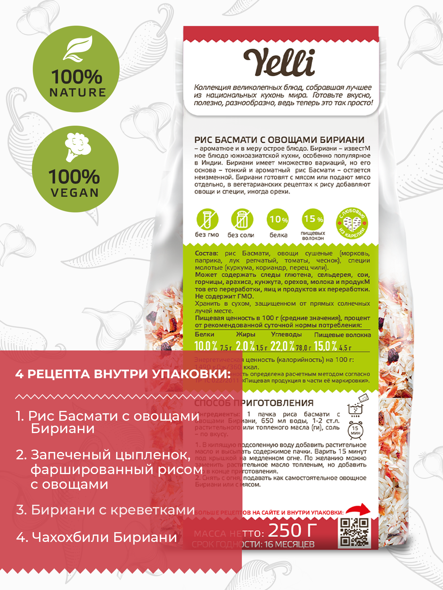| Состав | Рис Басмати с овощами Бириани Yelli 250г: рис Басмати, овощи сушеные (морковь, паприка, лук репчатый, томаты, чеснок), специи молотые (куркума, кориандр, перец чили). Кускус с ароматными травами Yelli 250г: кускус, овощи и зелень сушеные (петрушка, чеснок), травы сушеные (базилик, орегано, розмарин). Ризотто с томатами и базиликом Yelli 250г: рис среднезерный, овощи и травы сушеные (томаты, лук репчатый, базилик, чеснок). |