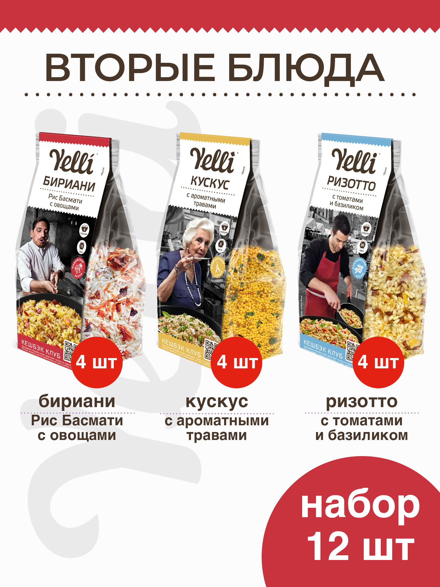 Купить Гарнир Yelli 12 шт. (Рис Басмати с овощами Бириани 4*250г, Кускус с ароматными травами Yelli 4*250г, Ризотто с томатами и базиликом 4*250г)
