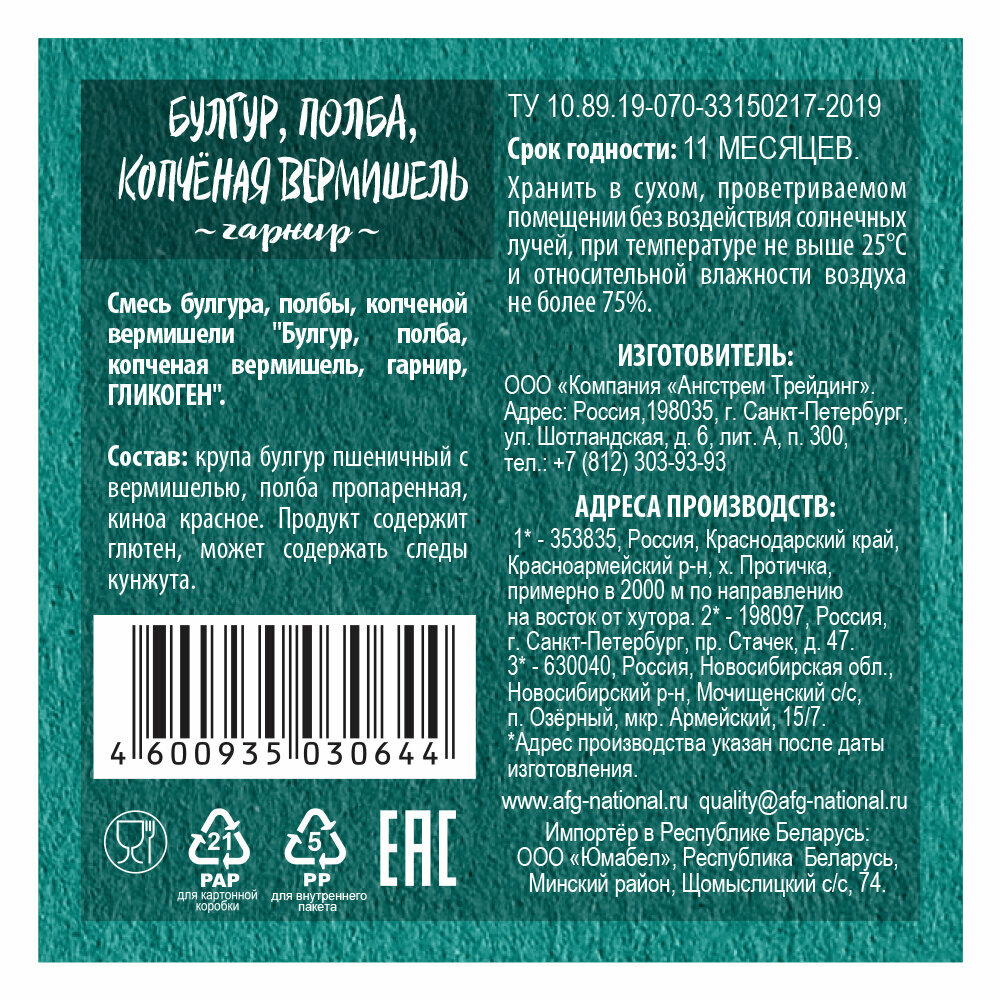 | Состав | Крупа булгур пшеничный с вермишелью, полба пропаренная, киноа красное. Содержит глютен, может содержать следы кунжута |