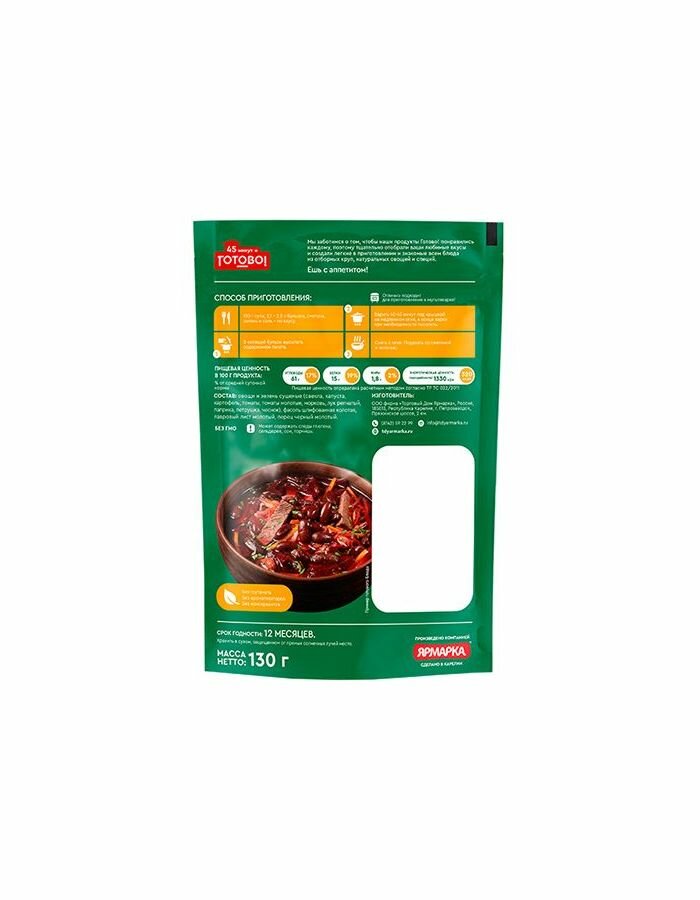 | Состав | овощи и зелень сушеные (свекла, капуста, картофель, томаты, томаты молотые, морковь, лук репчатый, паприка, петрушка, чеснок), фасоль шлифованная колотая, лавровый лист молотый, перец черный молотый. Может содержать следы глютена, сельдерея, сои, горчицы, арахиса, кунжута, орехов, молока и продуктов его переработки, яиц и продуктов их переработки. |