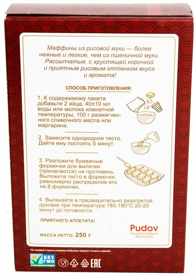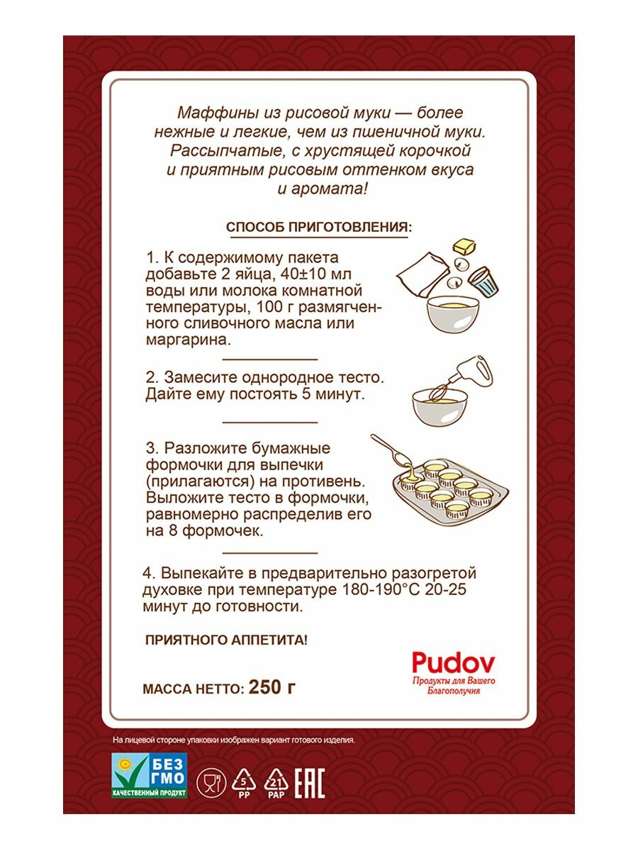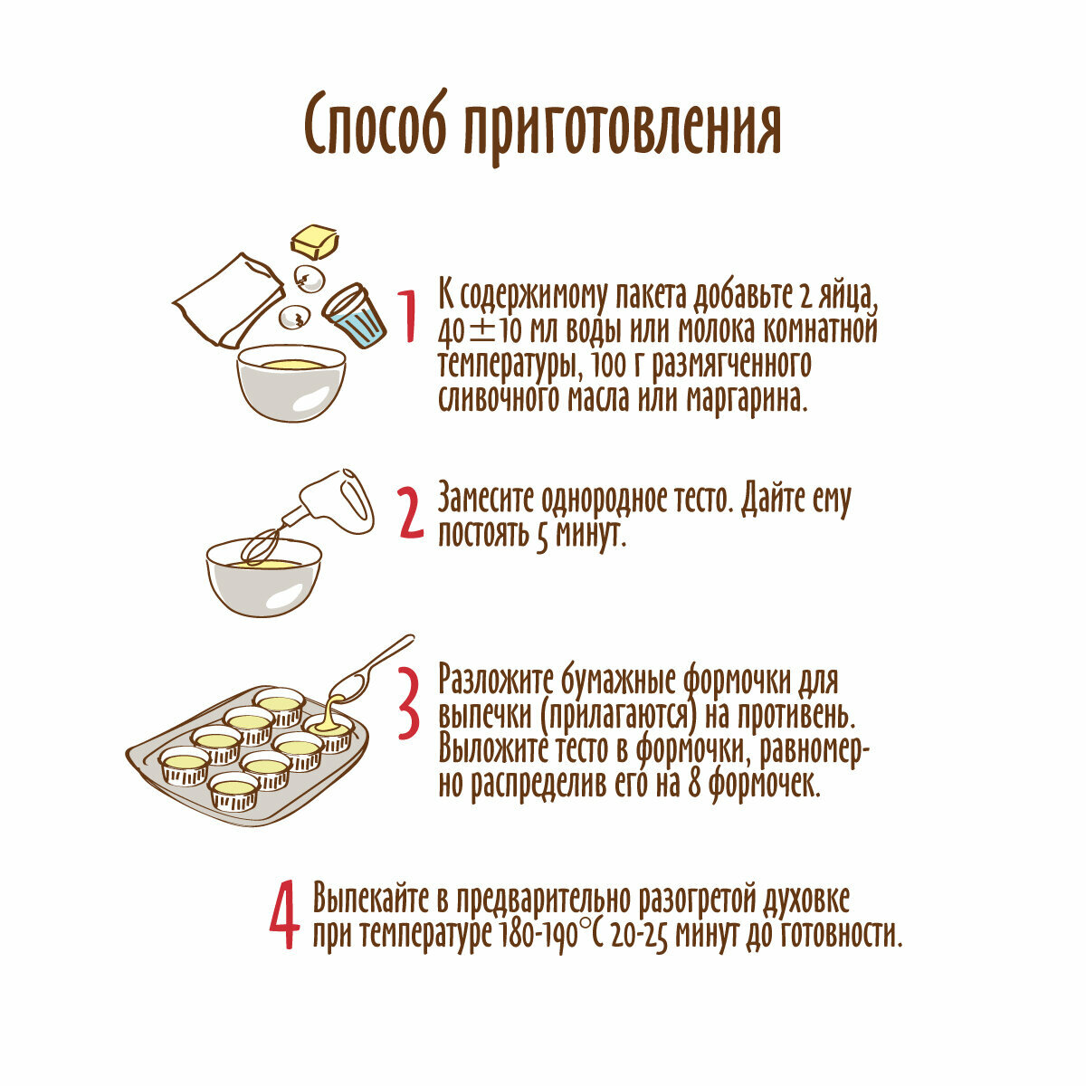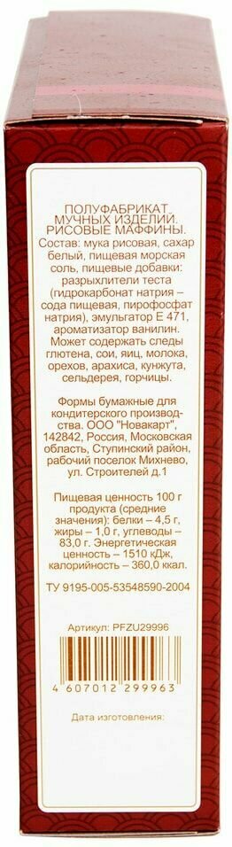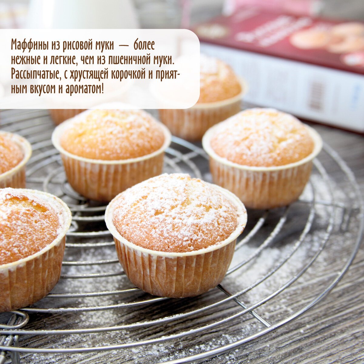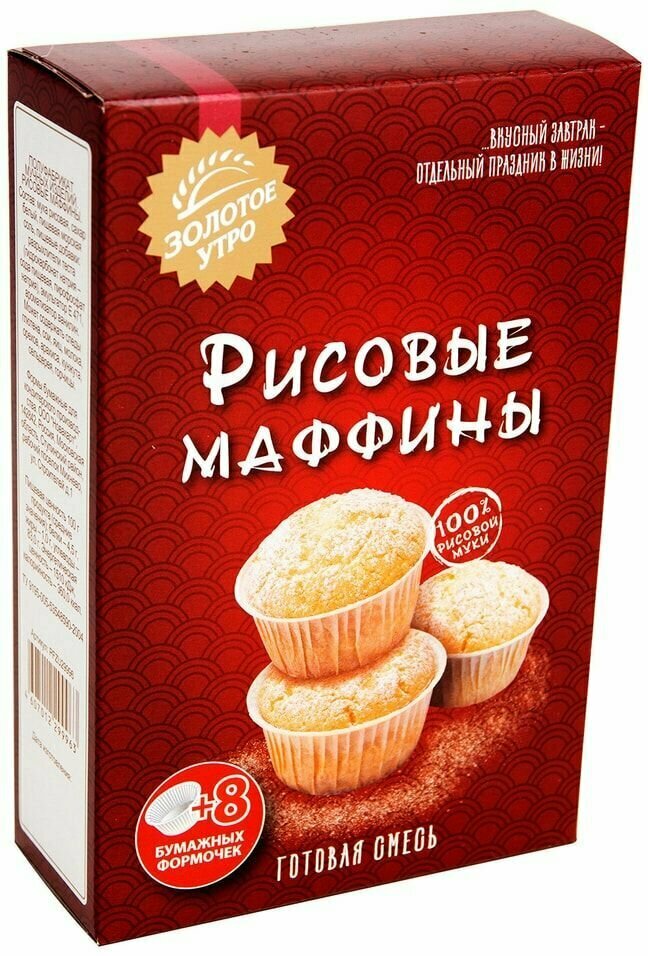 | Дополнительная информация | Рисовая мука в отличие от пшеничной менее калорийна, богата полезными микроэлементами и витаминами. И всё это без какого-либо ущерба для вкуса. Для вашего удобства мы положили в каждую коробку готовой смеси 8 бумажных формочек для маффинов. |