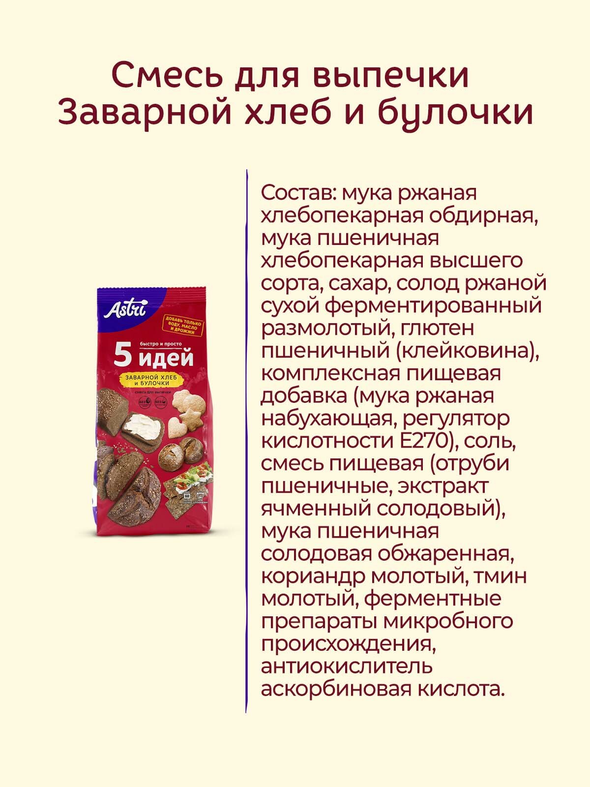 | Состав | мука ржаная хлебопекарная обдирная, мука пшеничная хлебопекарная высшего сорта, сахар, солод ржаной сухой ферментированный размолотый, глютен пшеничный (клейковина), комплексная пищевая добавка (мука ржаная набухающая, регулятор кислотности Е270), соль, смесь пищевая (отруби пшеничные, экстракт ячменный солодовый), мука пшеничная солодовая обжаренная, кориандр молотый, тмин молотый, ферментные препараты микробного происхождения, антиокислитель аскорбиновая кислота. Может содержать следы диоксида серы и сульфитов, кунжута, молока, сои, яиц и продуктов их переработки. |