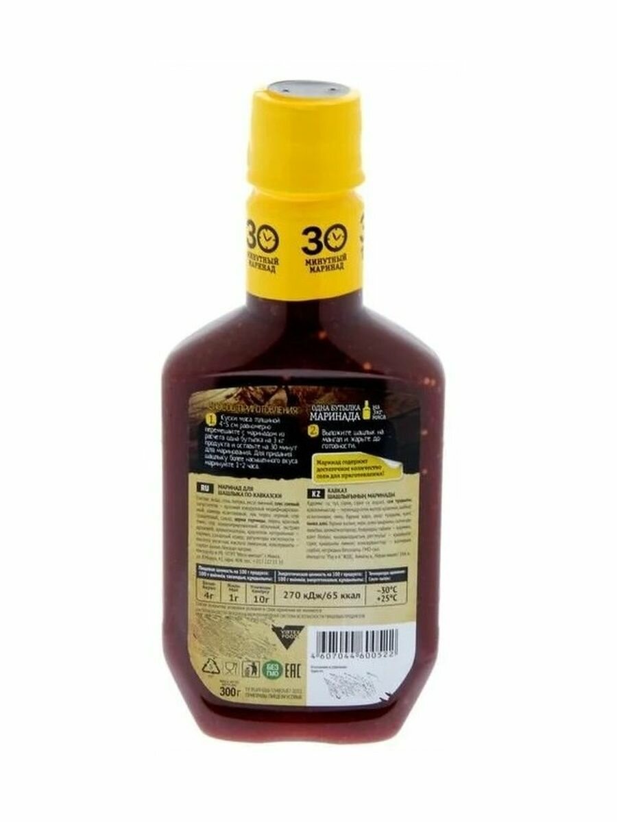| Способ приготовления | Куски мяса толщиной 4-5 см равномерно перемешайте с маринадом из расчета одна бутылка на 3 кг продукта и оставьте на 30 минут для маринования. Для придания шашлыку более насыщенного вкуса маринуйте 1-2 часа. Выложите шашлык на мангал и жарьте до готовности. |