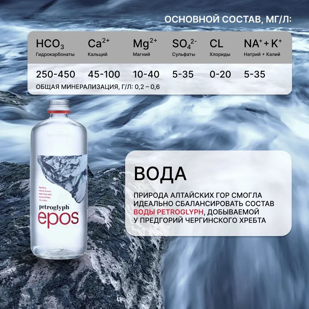Вода Petroglyph Epos газированная минеральная природная, 12 шт по 0,750 л (стекло) интересное:
