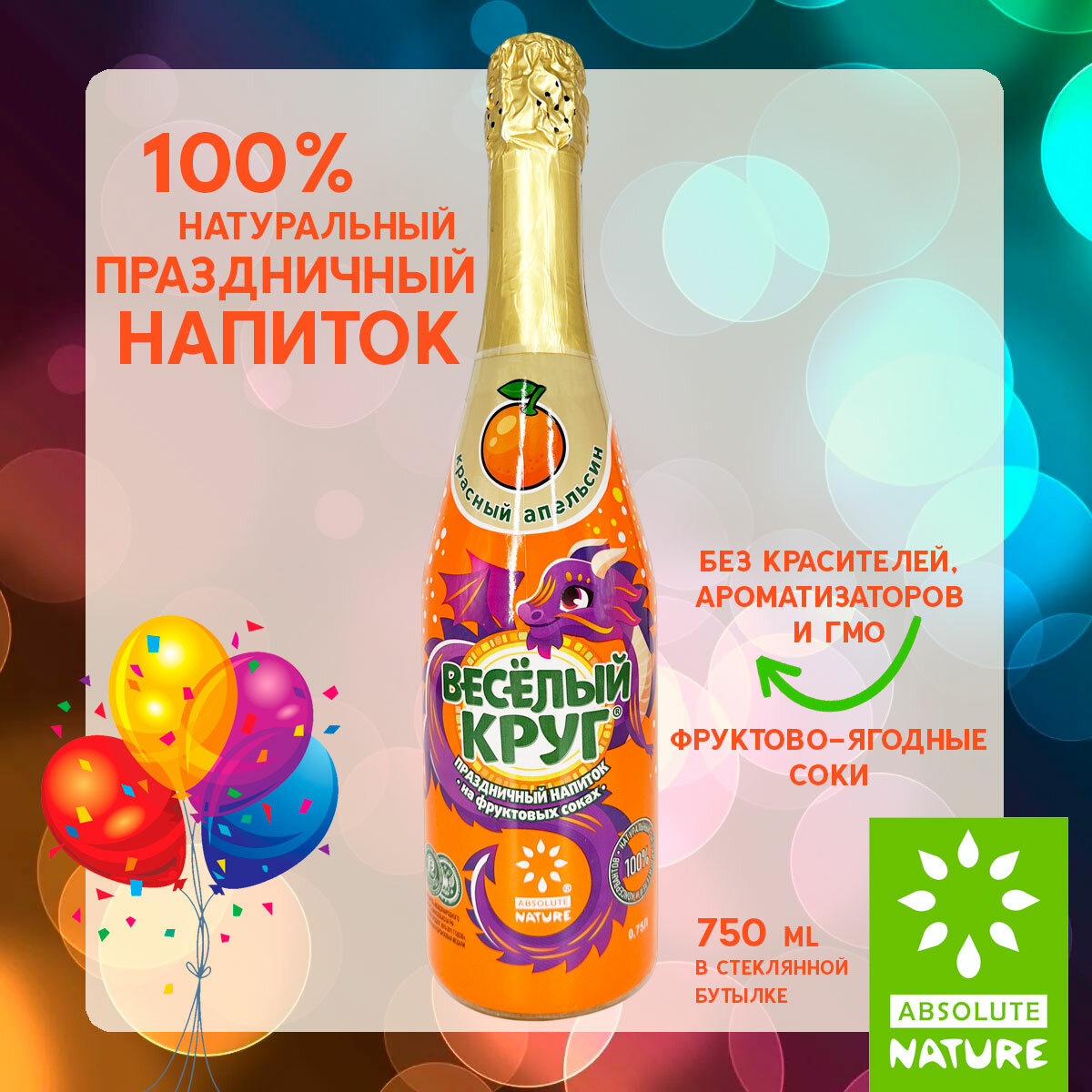 Купить Лимонад детское безалкогольное шампанское Absolute Nature "Веселый круг" красный апельсин, 0.75 л. на день рождения