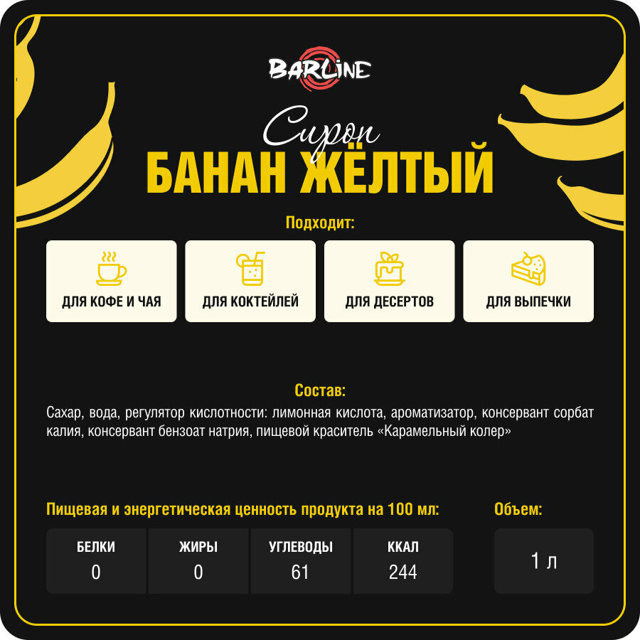 Купить Сироп Barline Банан жёлтый (Banana), 1 л, для кофе, чая, коктейлей и десертов, стеклянная бутылка с дозатором, Барлайн