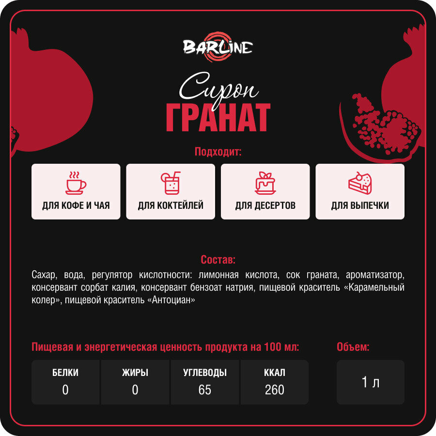Сироп Barline Гранат (Pome Granate), 1 л, для кофе, чая, коктейлей и десертов, пластиковая бутылка, Барлайн