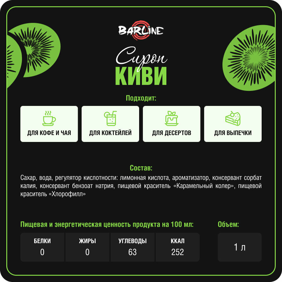 Купить Сироп Barline Киви (Kiwi), 1 л, для кофе, чая, коктейлей и десертов, стеклянная бутылка c рассекателем, Барлайн