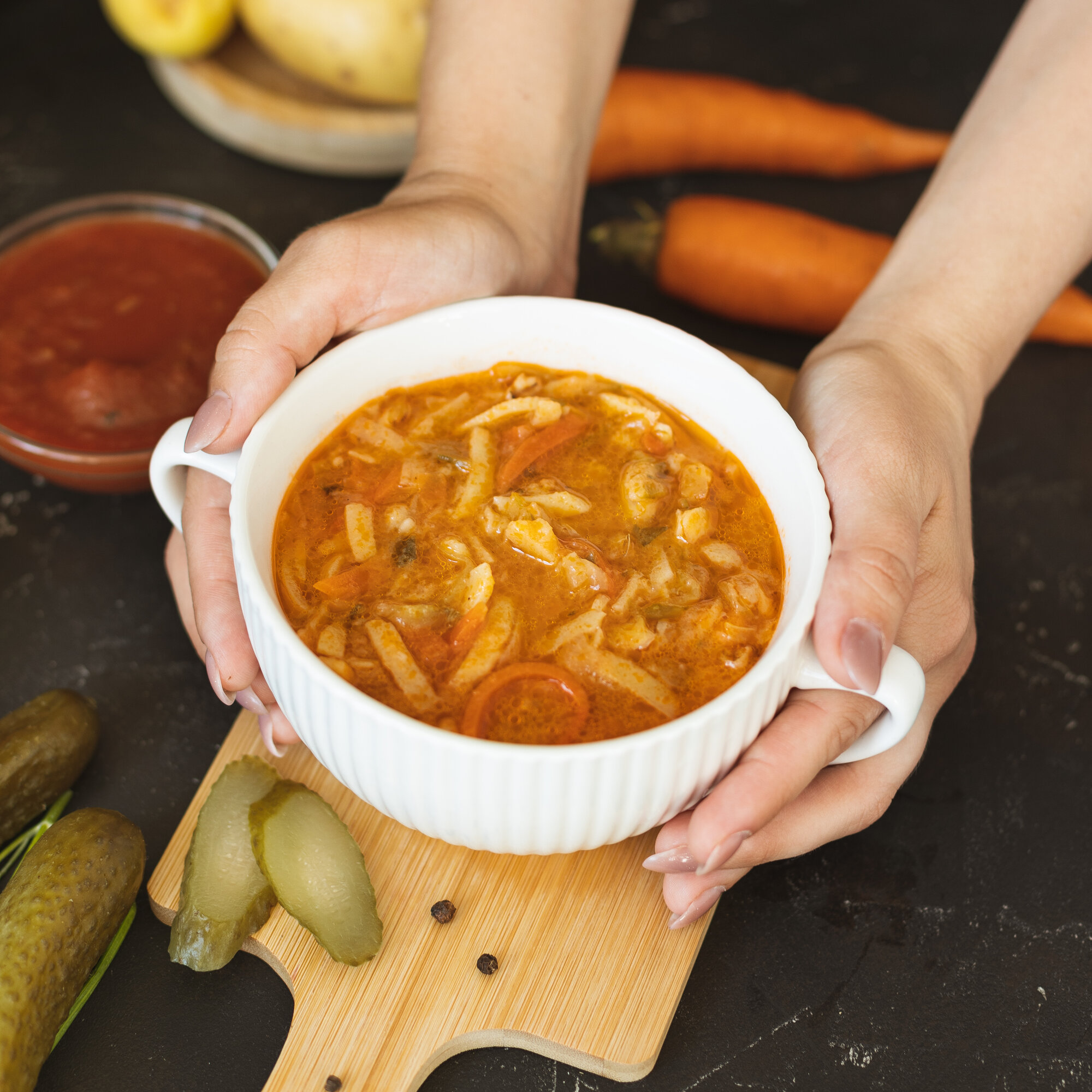 | Состав | Картофель, перловая крупа, огурцы соленые, соль, заправка: лук репчатый, морковь, белые коренья, томат паста, жир, мука пшеничная, перец черный горький, лавровый лист, зелень петрушки. |