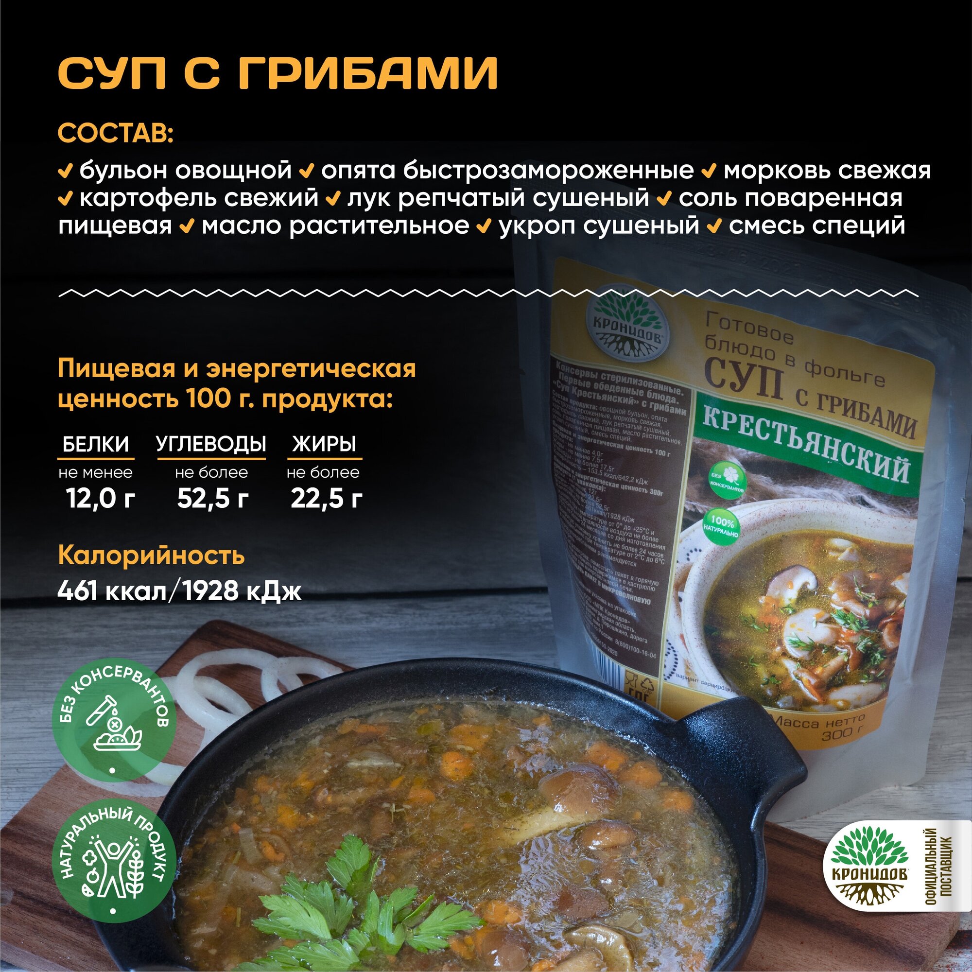 СохранитьНабор из 4 готовых блюд в реторт-пакете "Кронидов" Рассольник/Суп с грибами Крестьянский/Суп фасолевый с говядиной/Суп Марокканский интересное: