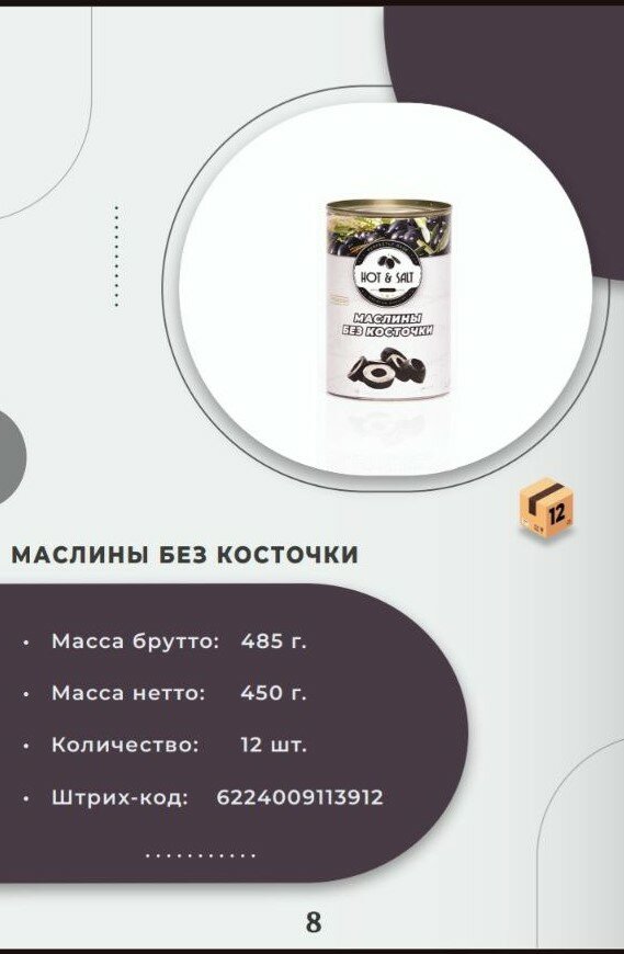 | Состав | маслины без косточки, вода, соль, глюконат железа Е576, молочная кислота Е270 |