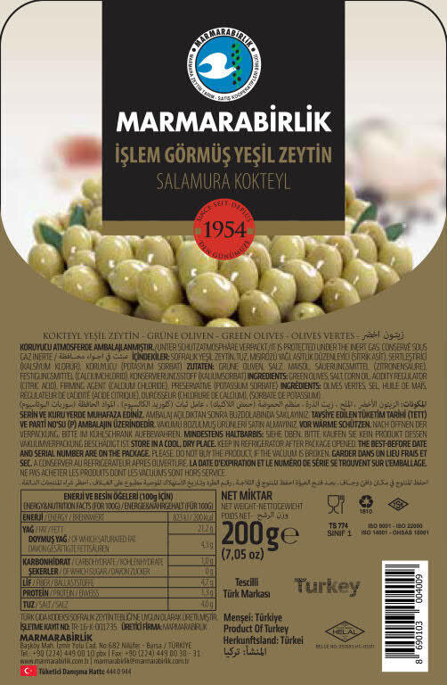 СохранитьMARMARABIRLIK Вакуумная уп., оливки коктейльные 200 гр, калибровка 2XL 161-180 шт/кг (KOKTEYL YESIL ZEYTIN VAKUM) интересное: