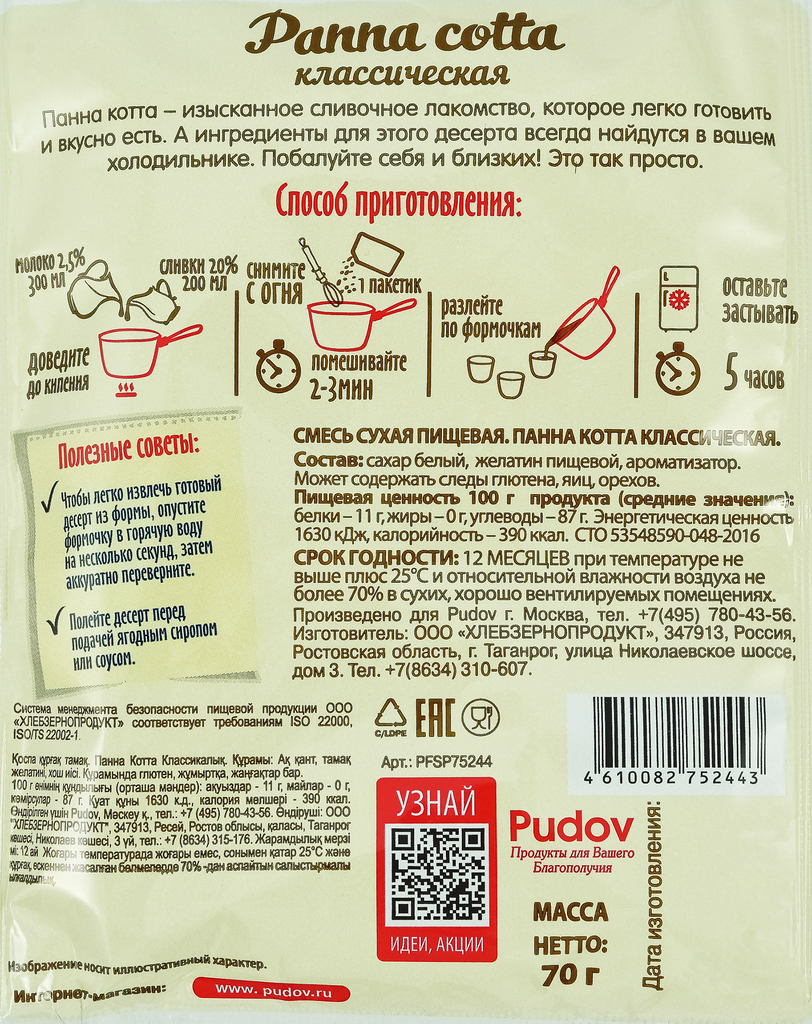 Смесь для десерта Панна Котта классическая С.Пудовъ, 70 г интересное: