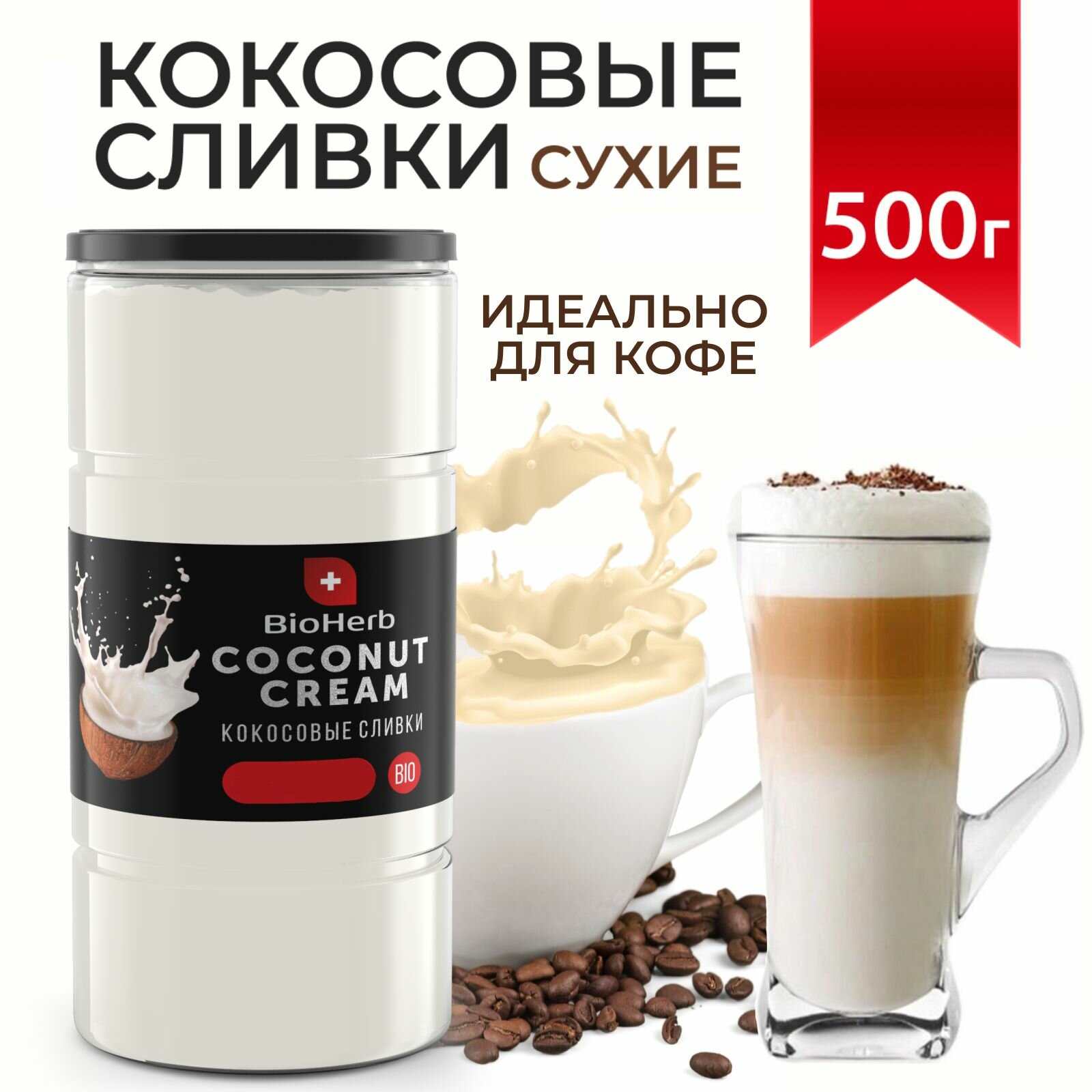 Купить BioHerb Кокосовые сливки сухие, для кофе и чая, растительные, 95% мякоти кокоса, 500 г
