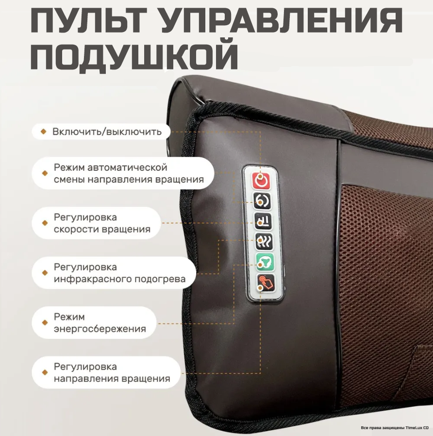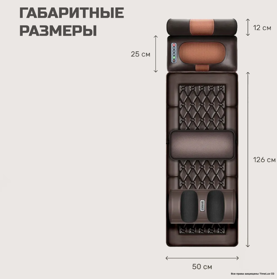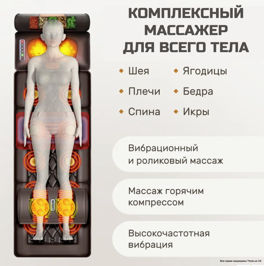 | Комплектация | Ароматическая подушка валик; массажная подушка для шеи и плеч; массажный матрас с роликами; массажер для ног; пульт управления; инструкция на английском языке |