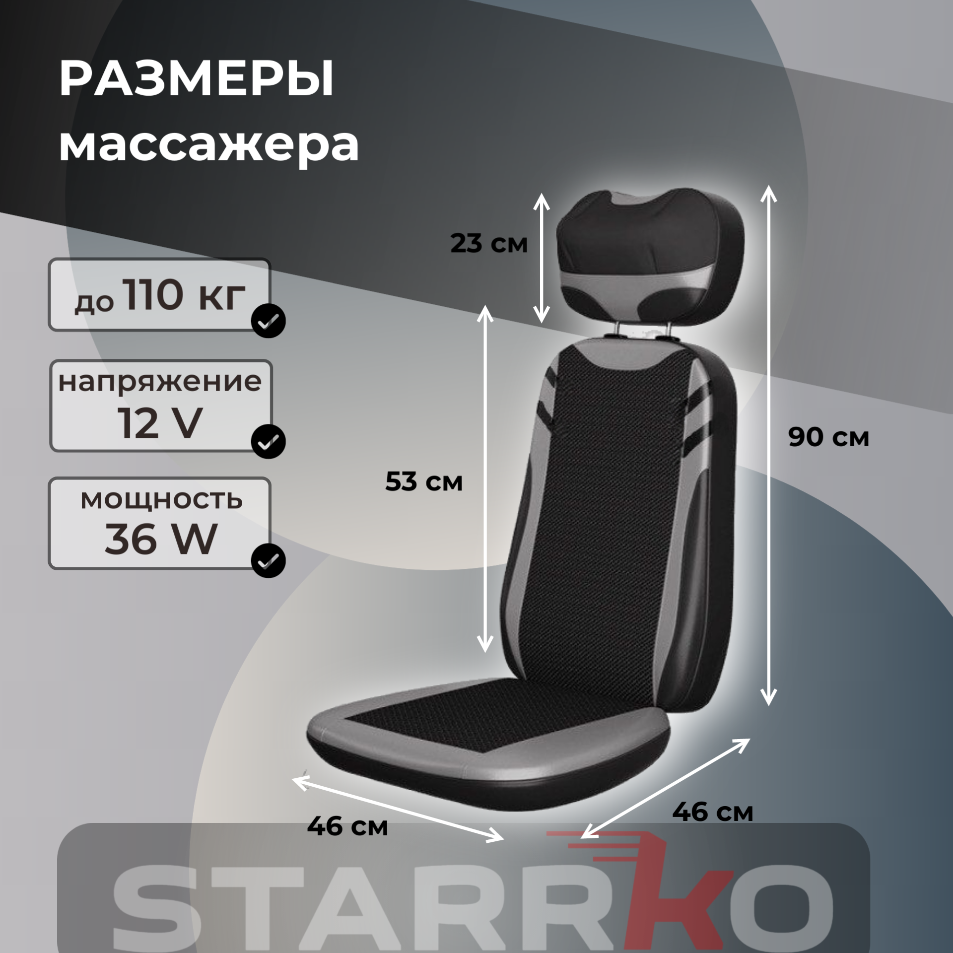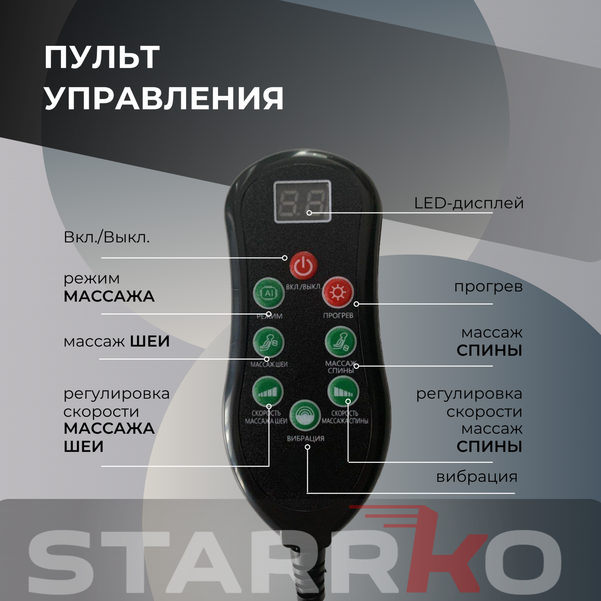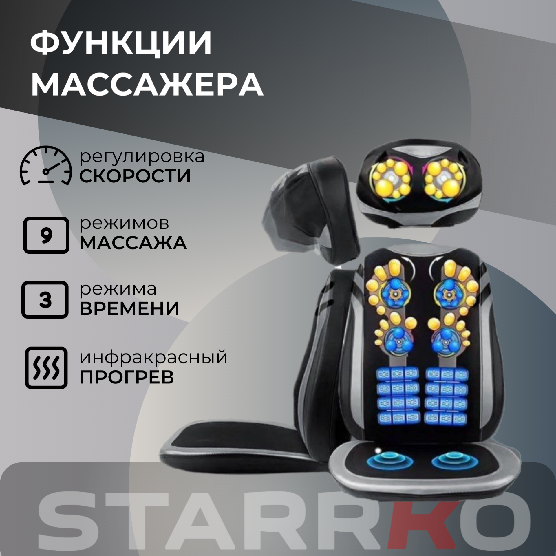 | Комплектация | подголовник массажер для шеи и плеч роликовый, массажная спинка роликовая с инфракрасным прогревом, массажная подушка вибрационная для ягодиц и бедер, пульт управления на русском языке, инструкция на русском языке, адаптер для использования в автомобиле |