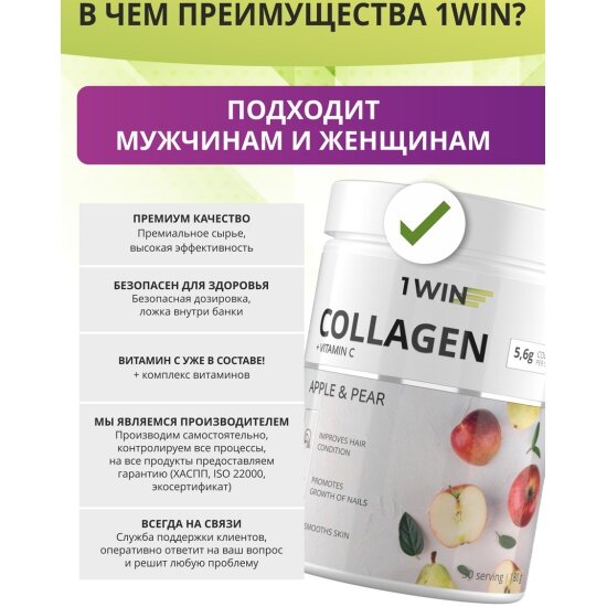 Купить Коллаген порошок с витамином C 1WIN, растворимый для суставов и связок, вкус Яблоко-груша, 30 порций
