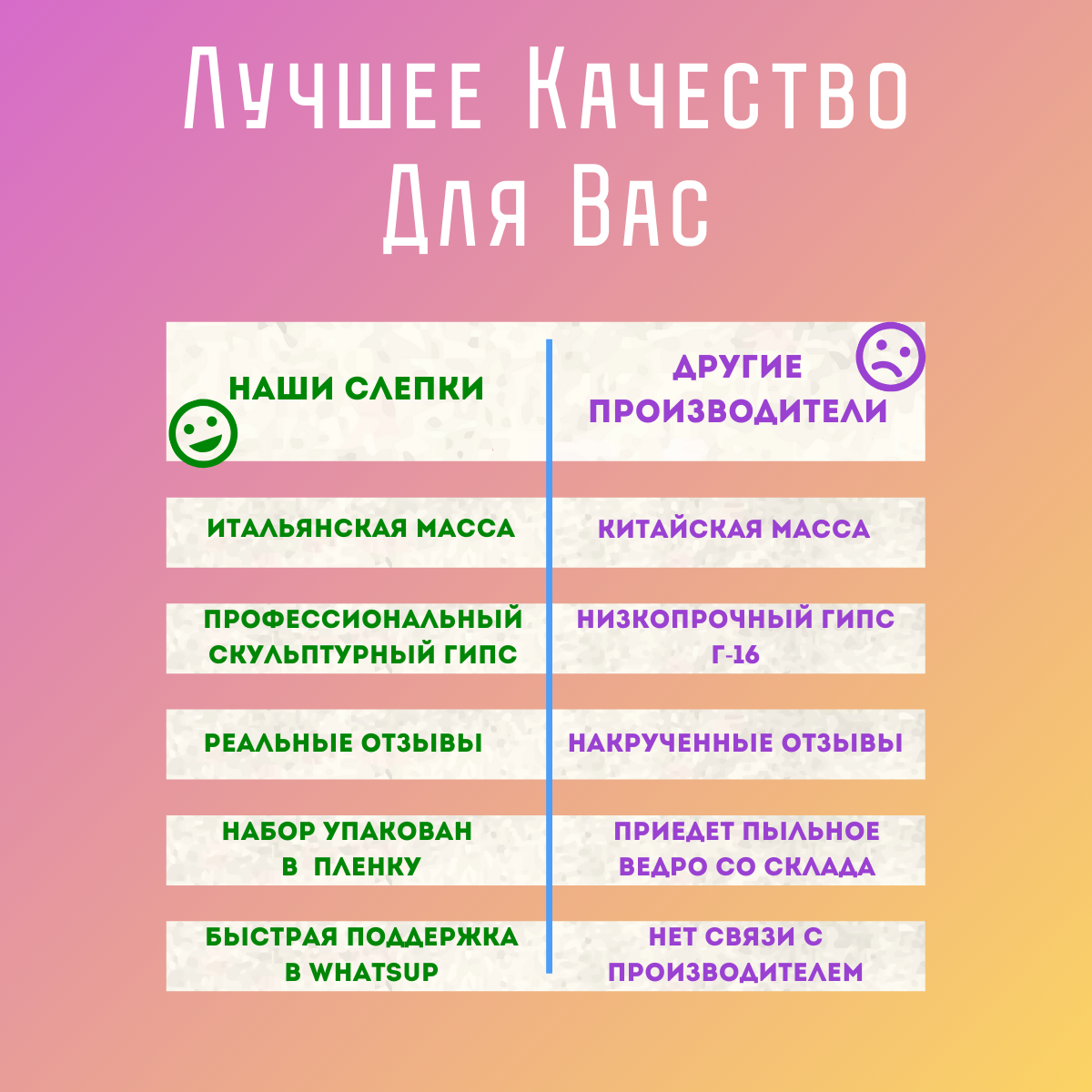 | Комплектация | Cлепочная масса - производство Италия, Белый скульптурный гипс, Удобное ведро, Деревянные спицы для обработки слепка, Подробная инструкция с визуализацией процесса; |