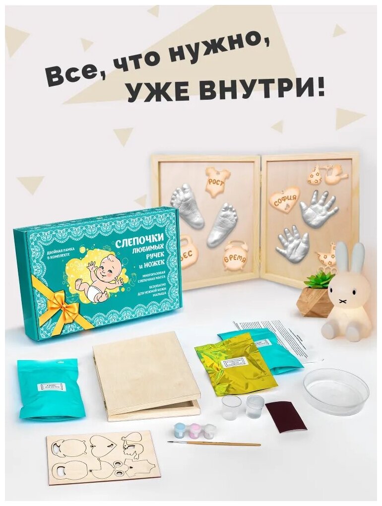 Набор для создания 3Д слепков ручек и ножек малыша из гипса с деревянной рамкой и краской ,в подарочной коробке. интересное: