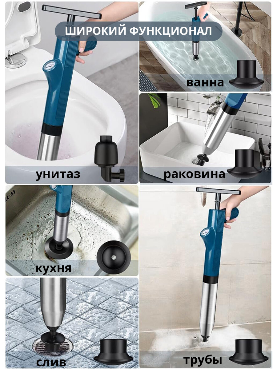 | Комплектация | Пневмовантуз - 1шт; насадка для унитаза - 1шт; колено-переходник - 1шт; насадка для раковины - 1шт; насадки для сливных отверстий - 2шт; ручка для накачивания - 1шт; упор для ног - 1шт; настенный держатель - 1 шт.; инструкция-1шт |